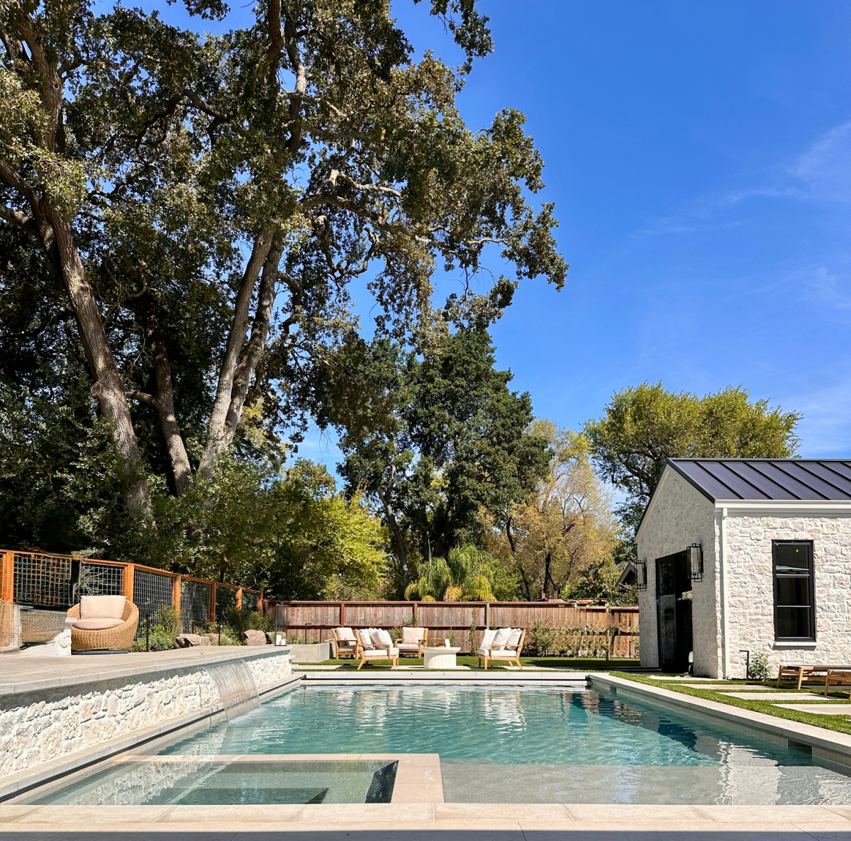 Step outside to the oasis. To the left is the outdoor kitchen and dining loggia as well as an in-law suite/yoga room/kids hangout/pool house space.