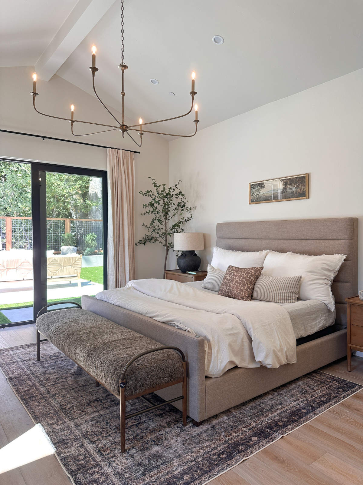 The primary bedroom also opens up to the backyard oasis. Kim and I loved the end-of -bed bench. My dogs would love it too.
