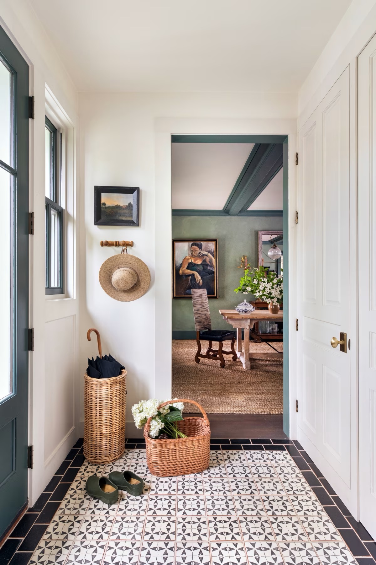 The foyer is so fresh and bright. Look at that tile and view into the green dining room.