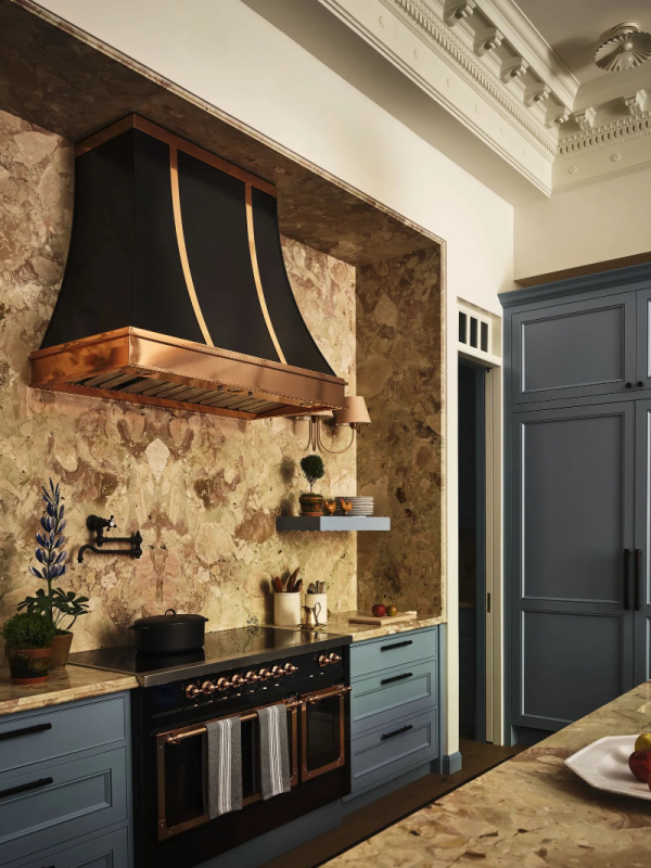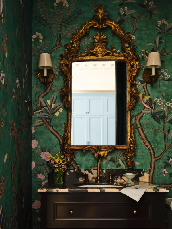 The kitchen is a wow. The copper trimmed custom hood was designed by Jonathan. And the powder room makes quite a statement with its custom wallpaper and vintage Italian mirror.