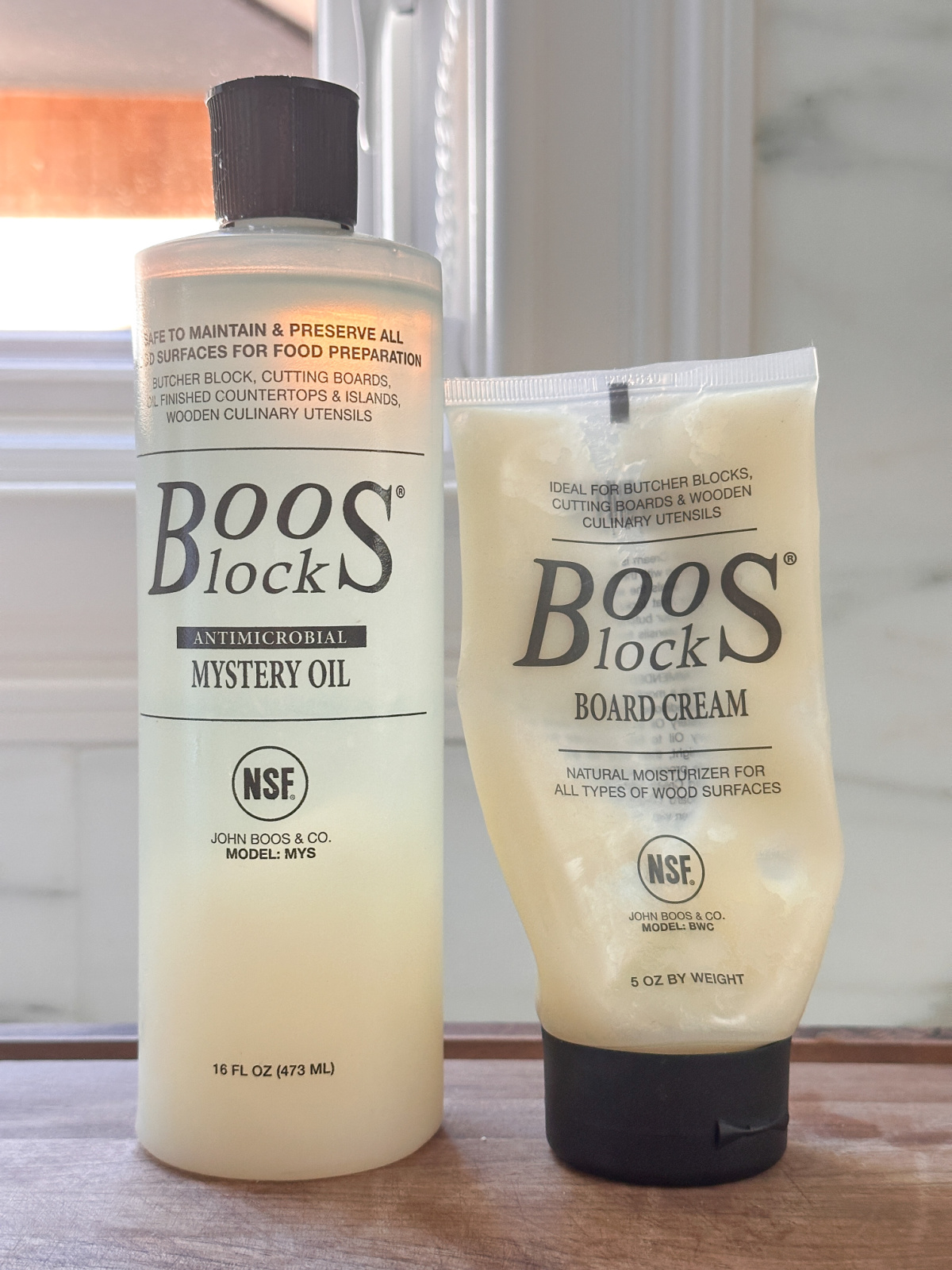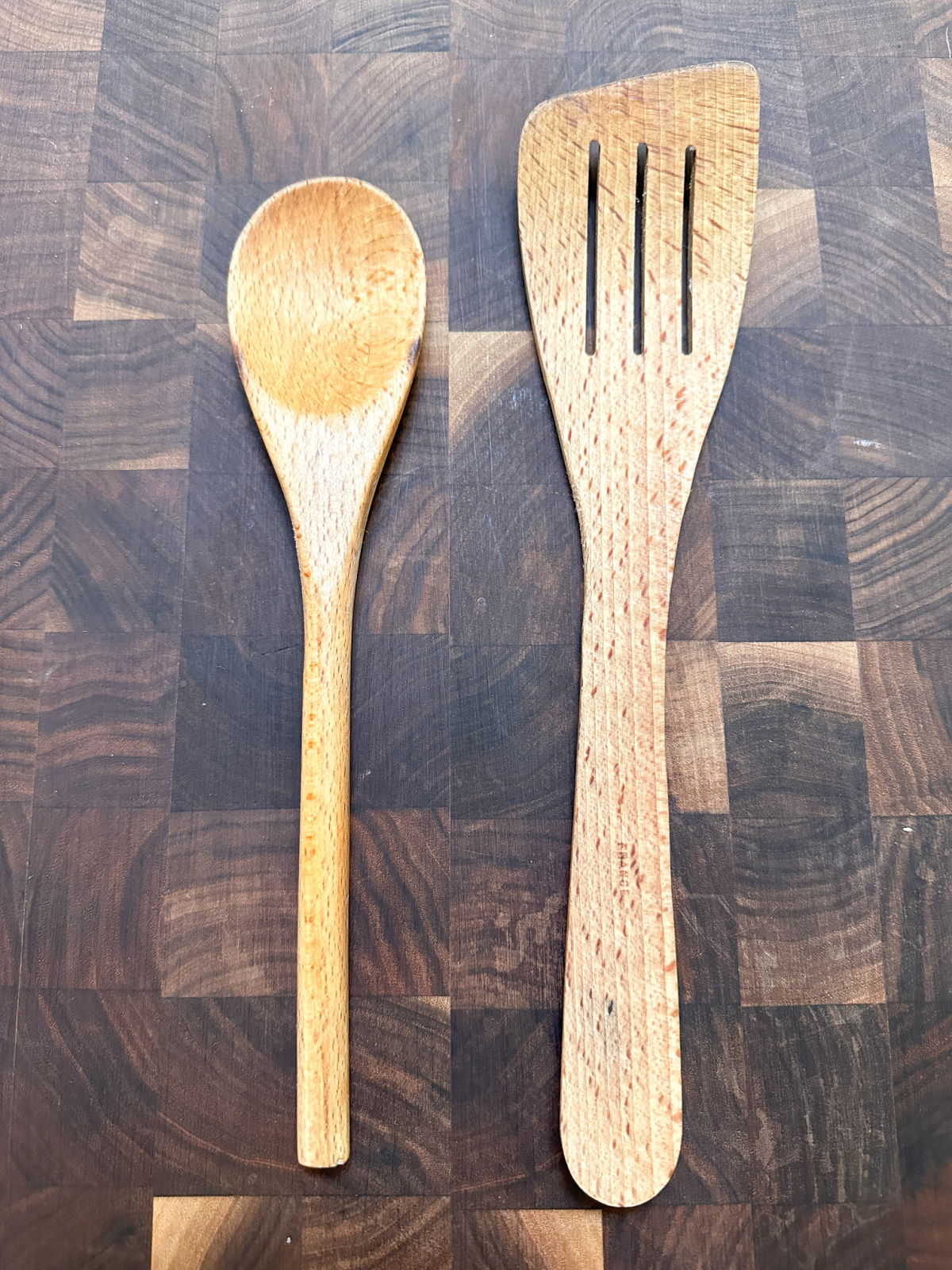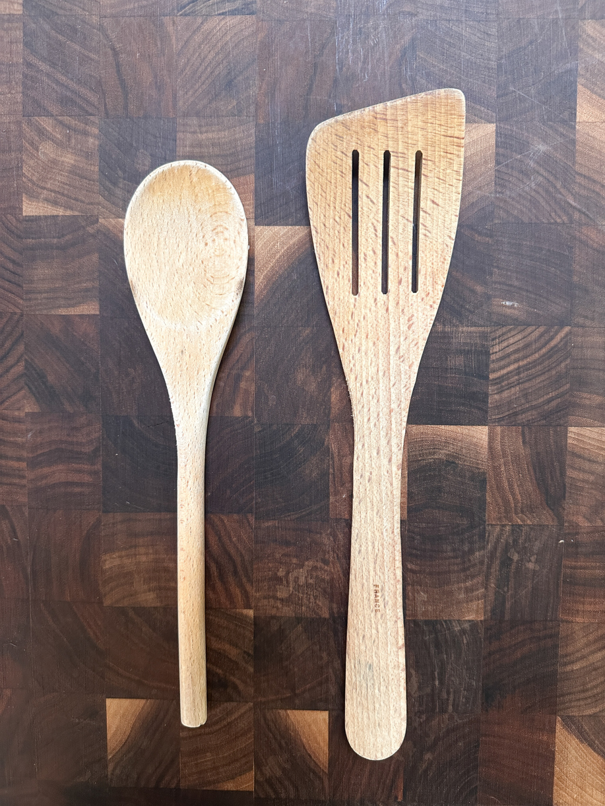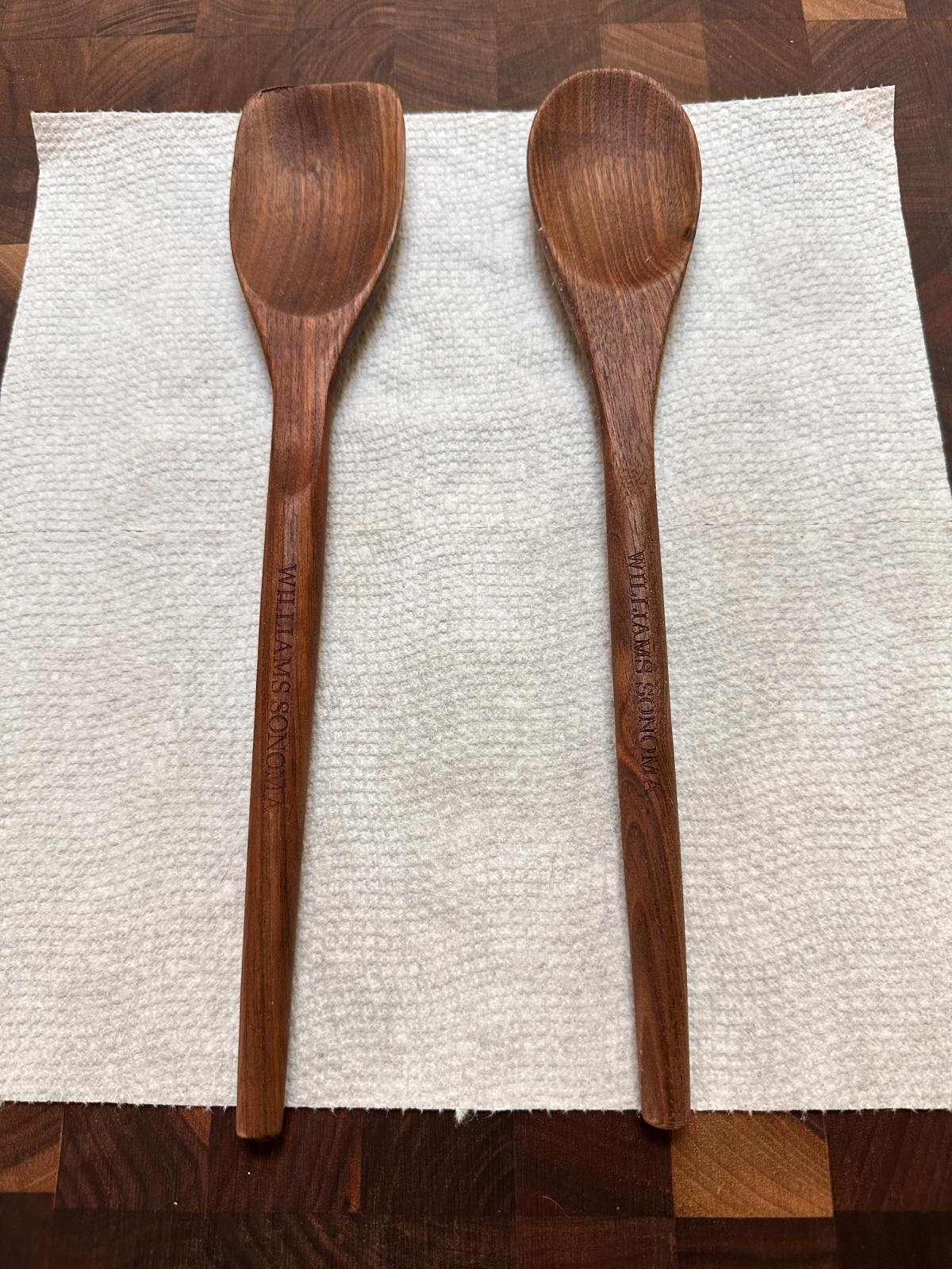 When I came across an article in WireCutter (if it’s paywalled, I’m sorry) on reviving wooden spoons and utensils and I was off to the races. Turns out that caring for wooden spoons is pretty much the same as caring for wooden cutting boards. Jim’s in charge of cutting boards at our house so he had the stuff I needed. Well, two things, Boos Mystery Oil and Board Cream. Essentially food-grade mineral oil and beeswax.