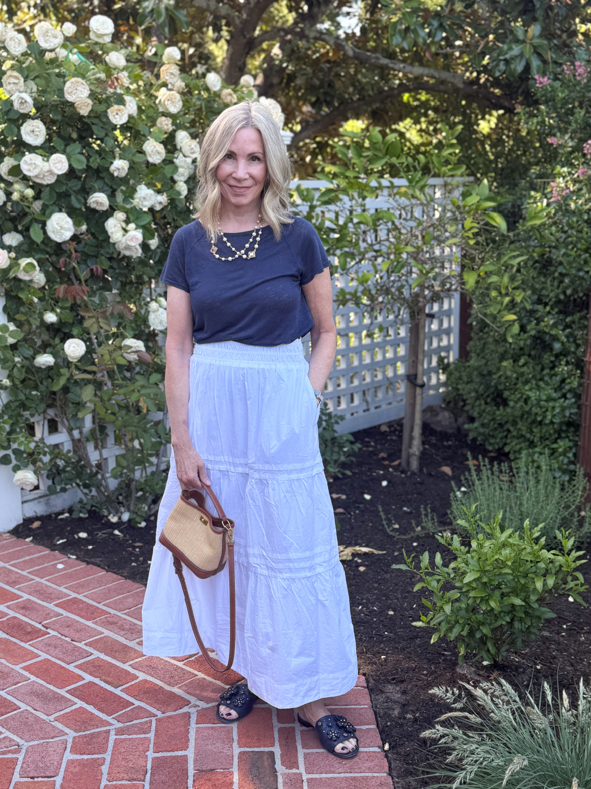I love that white skirt – so summery but I also noticed your super pretty necklace! I’d love the info on it if it’s at all purchase-able.