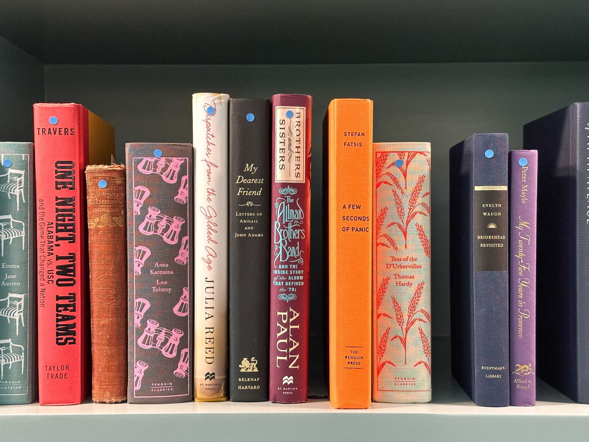 The Books-by-the-Foot will be staying behind in Snowberry’s library. I bought sets of these colorful dot labels – they stick to the books, but peel away without leaving residue – to mark the books that are staying, the books to be packed to move with us, and those to donate. Jim dropped the last of the donations at the Orinda Library this week.