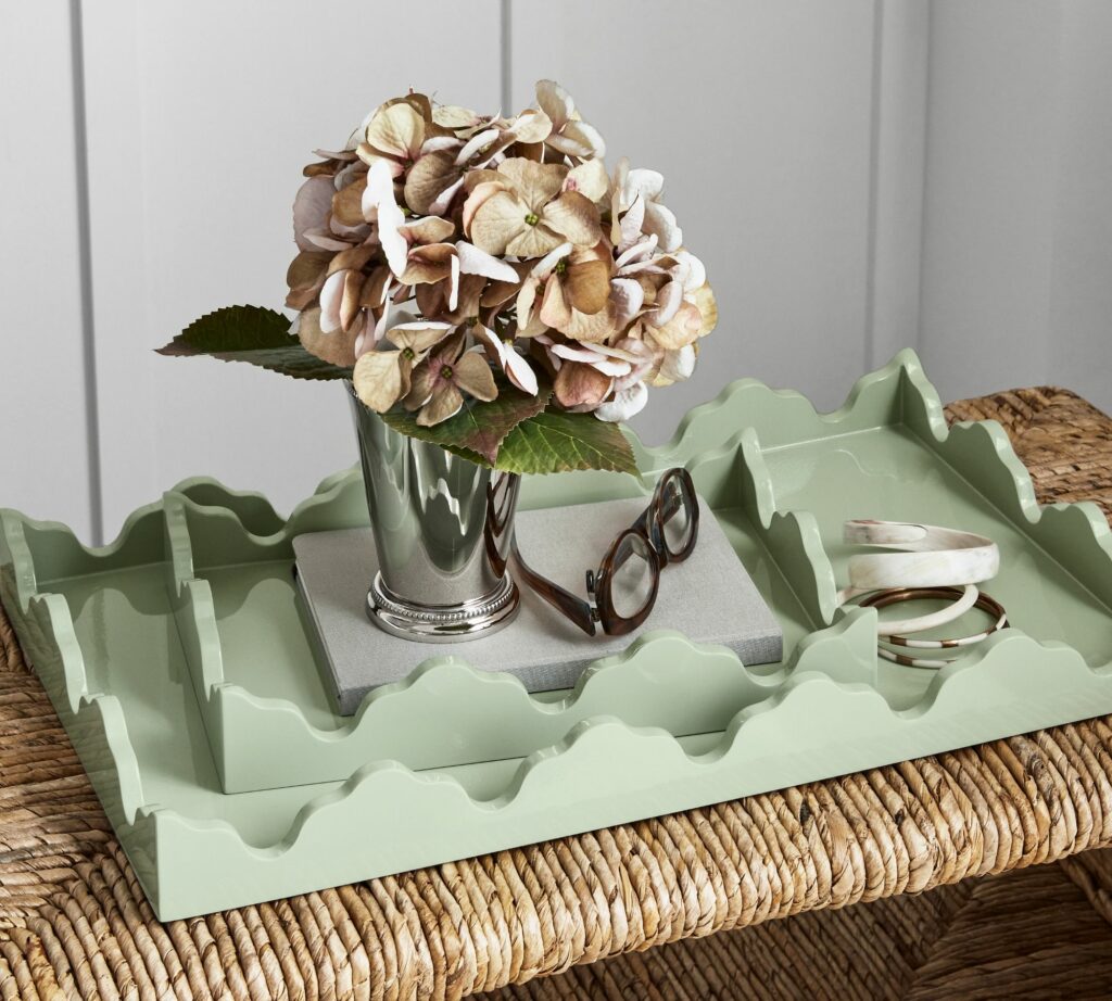 A few more of my favorites from the collab are this rosette chain serving bowl and platter. The bowl is in my cart, I think it would make a nice a centerpiece bowl for my kitchen table. These scalloped lacquer trays are beautiful too.