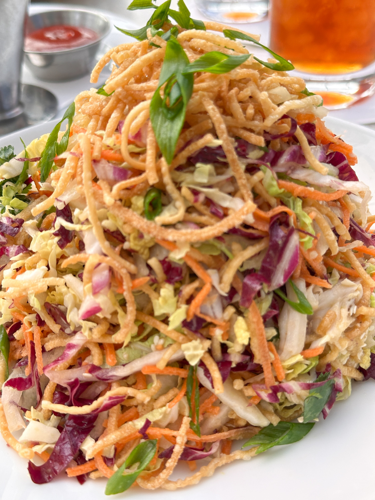 We had a balanced lunch of French fries, Chinese chicken salad, iced tea, and a chocolate chip cookie.