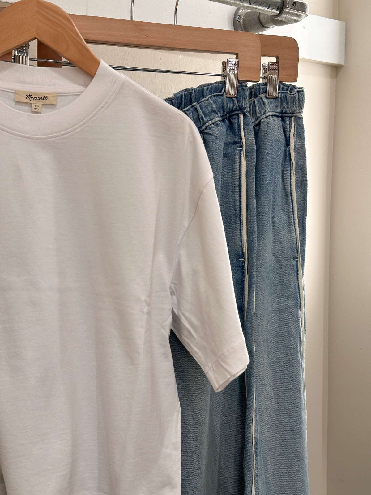 My favorite basic tee is Quince’s organic cotton slub knit. The white is not a bright white and I like the bit of texture. You can buy a bundle of three for under $50!