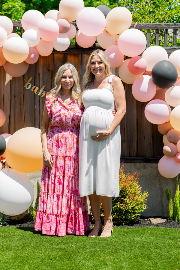 Last weekend Jim and I attended a couples baby shower for my granddaughter by (former) marriage, Deanna, her husband Tom, and soon-to-be big brother Carter. It was a poolside party and we had so much fun. Blog post coming soon, but I know you want to know what I wore … right now! Ok … maybe I want to tell you what I wore right now. The theme of the shower was Baby in Bloom with a dusty rose/peachy pink color scheme.