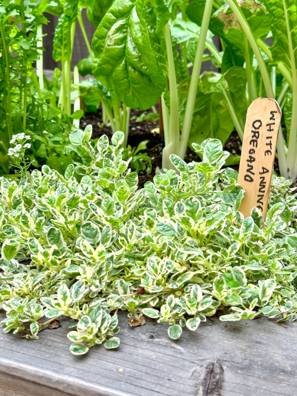 Raised bed garden trellis with herbs.