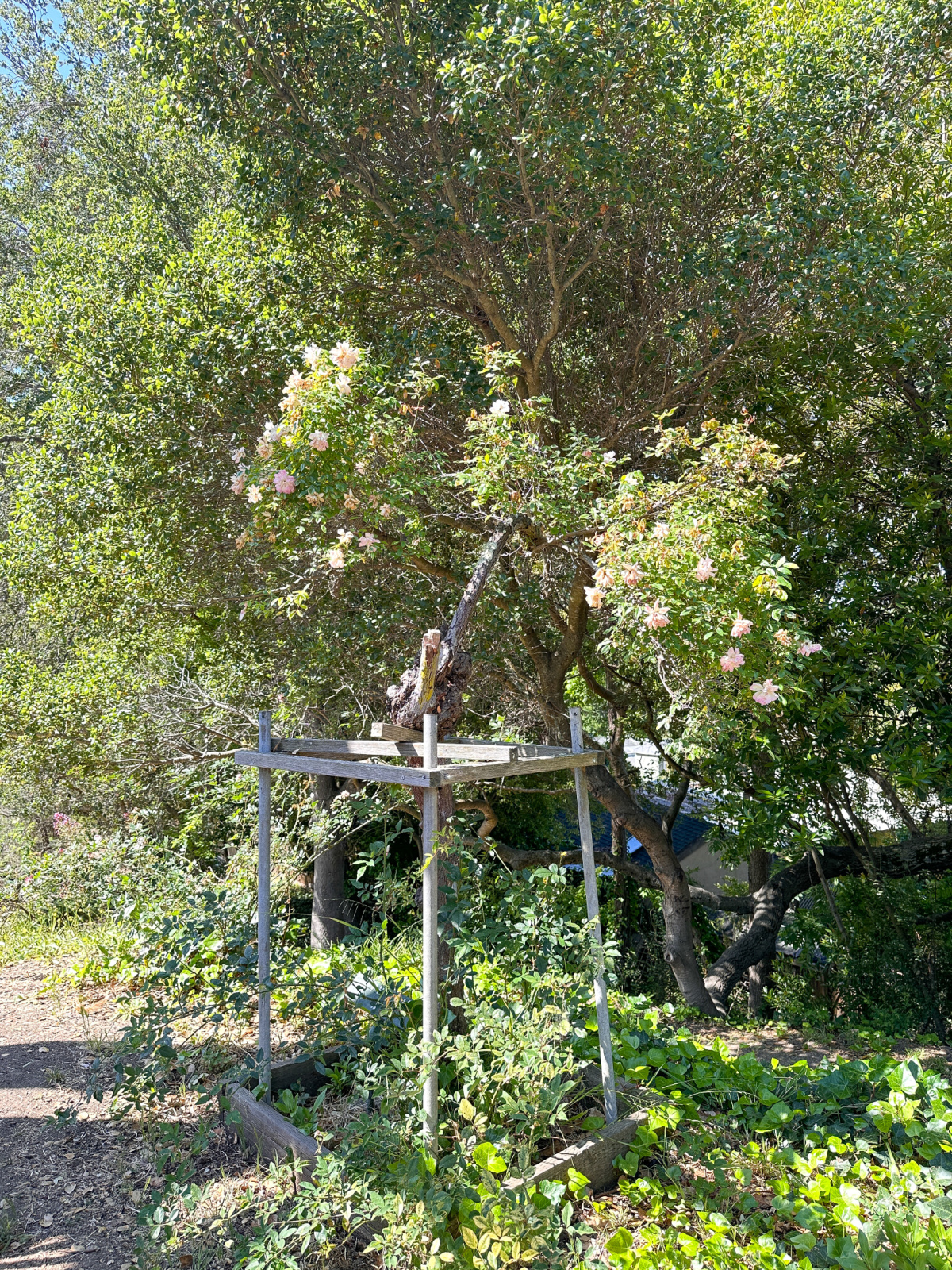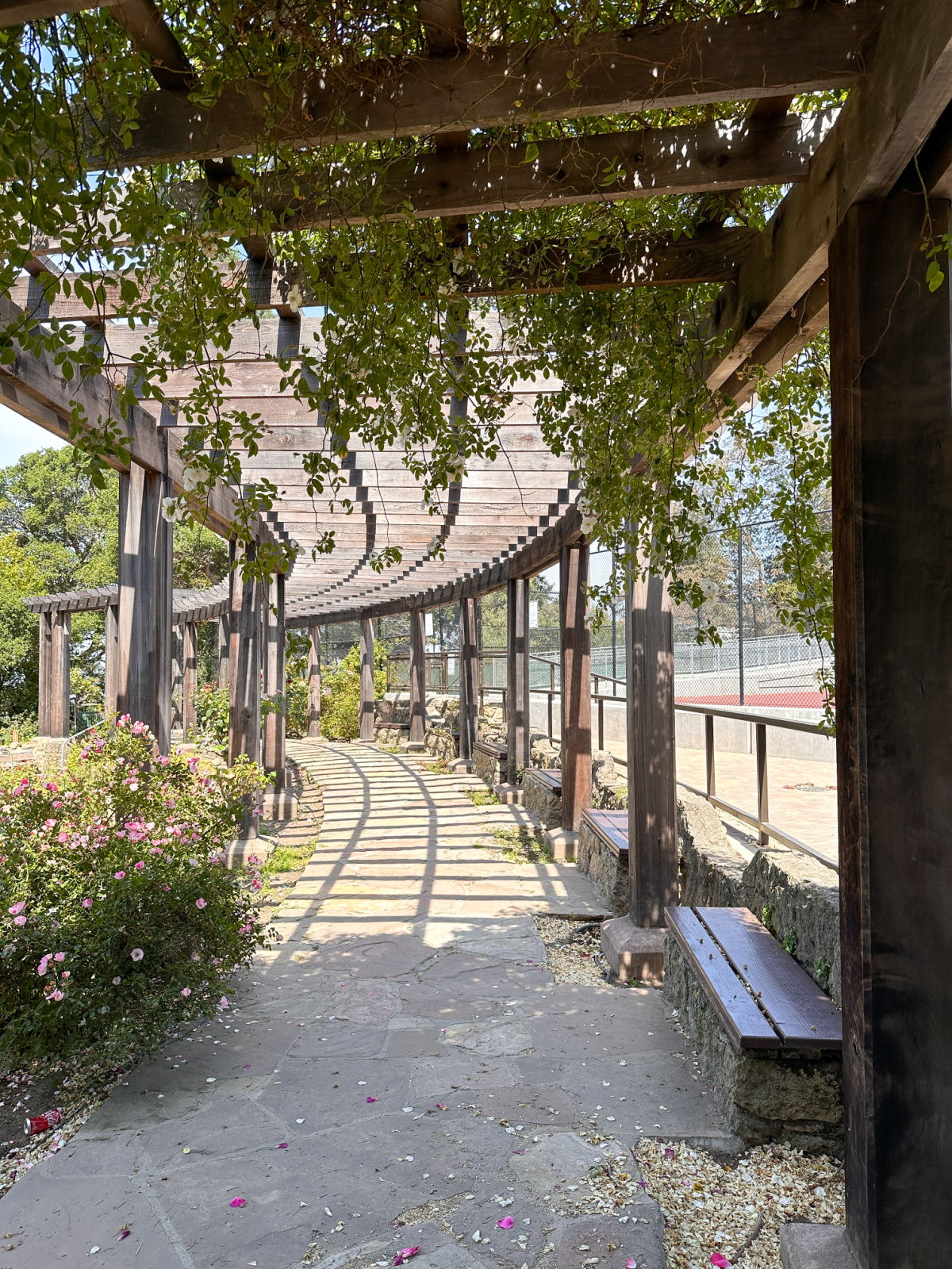 The rose garden is part of a city-owned park in North Berkeley constructed in the form of a terraced amphitheater. Part of a national public works project it got stated in 1933 and opened to the public in 1937. The garden is in the middle of a residential neighborhood (fabulous old homes and views) with four public tennis courts to one side of the garden, and Codornices Park across the street. Apparently a pedestrian tunnel connects the two but I didn’t explore beyond the garden.