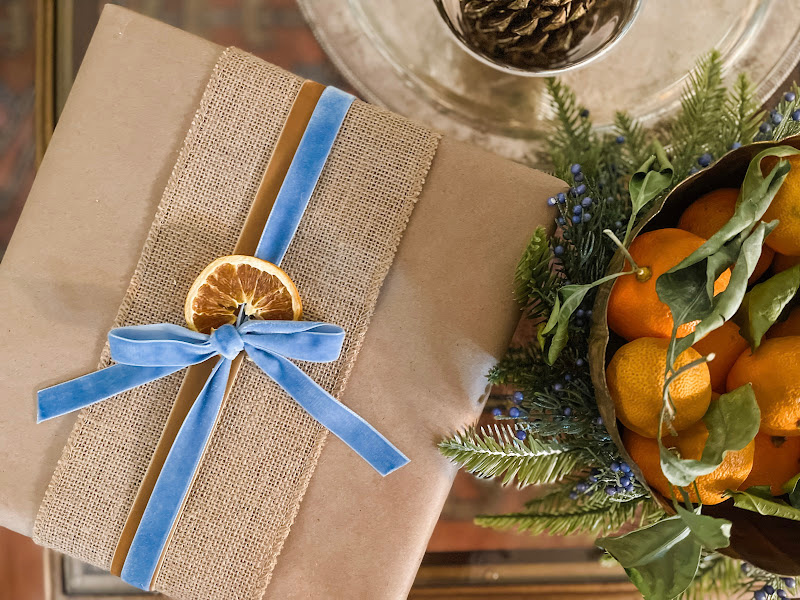Plain brown wrapping paper, with a 5″ burlap wrap, tied with two velvet ribbons, a 1″ ribbon in antique gold and 5/8″ ribbon in blue, with a dried orange slice on top.