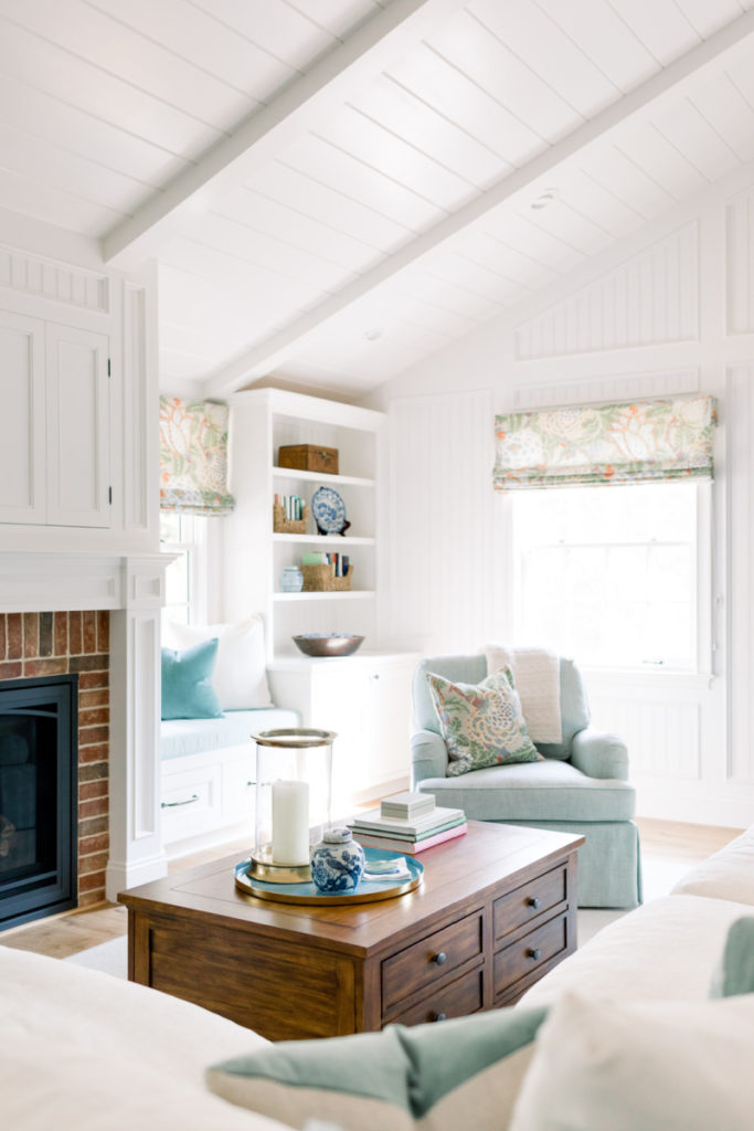 Exposing the pitched ceiling was a great idea! Pun intended. I decided against a chandelier. It would have hung directly over the center of the sectional sofa and who wants an overhead light shining down when watching TV. Not me. Truth be told I don’t want an overhead light shining down on me anywhere anytime. I only use the overhead lights to vacuum or search for a lost earring.