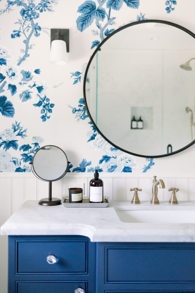 In the main bathroom … I fell in love with these French Cuff Wall Sconces and used three across the vanity.