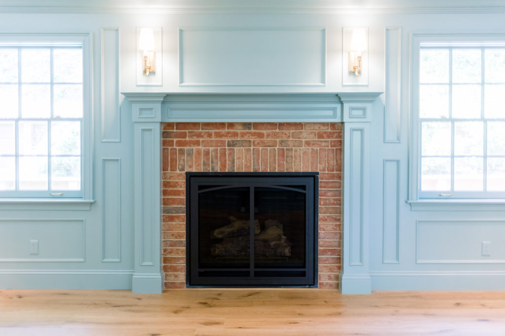 Sconces over the fireplace mantle would have been nice. The space isn’t terribly wide, and doors to hide the TV took priority.