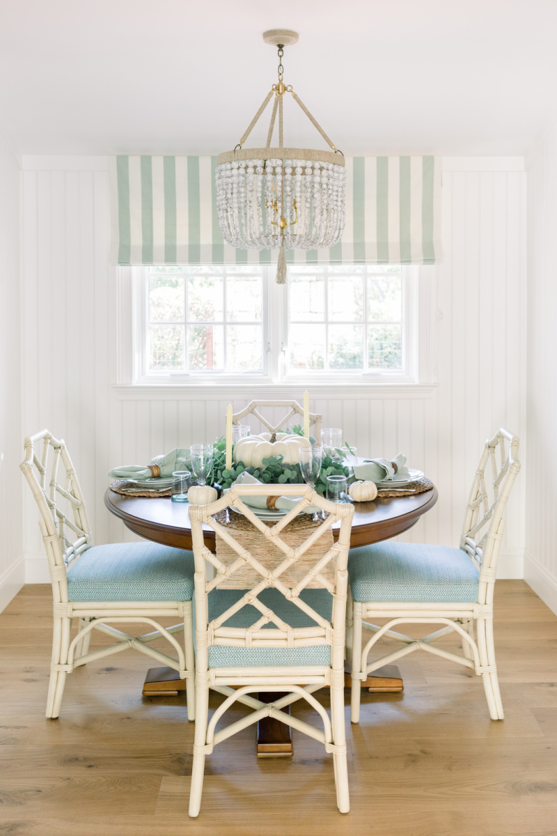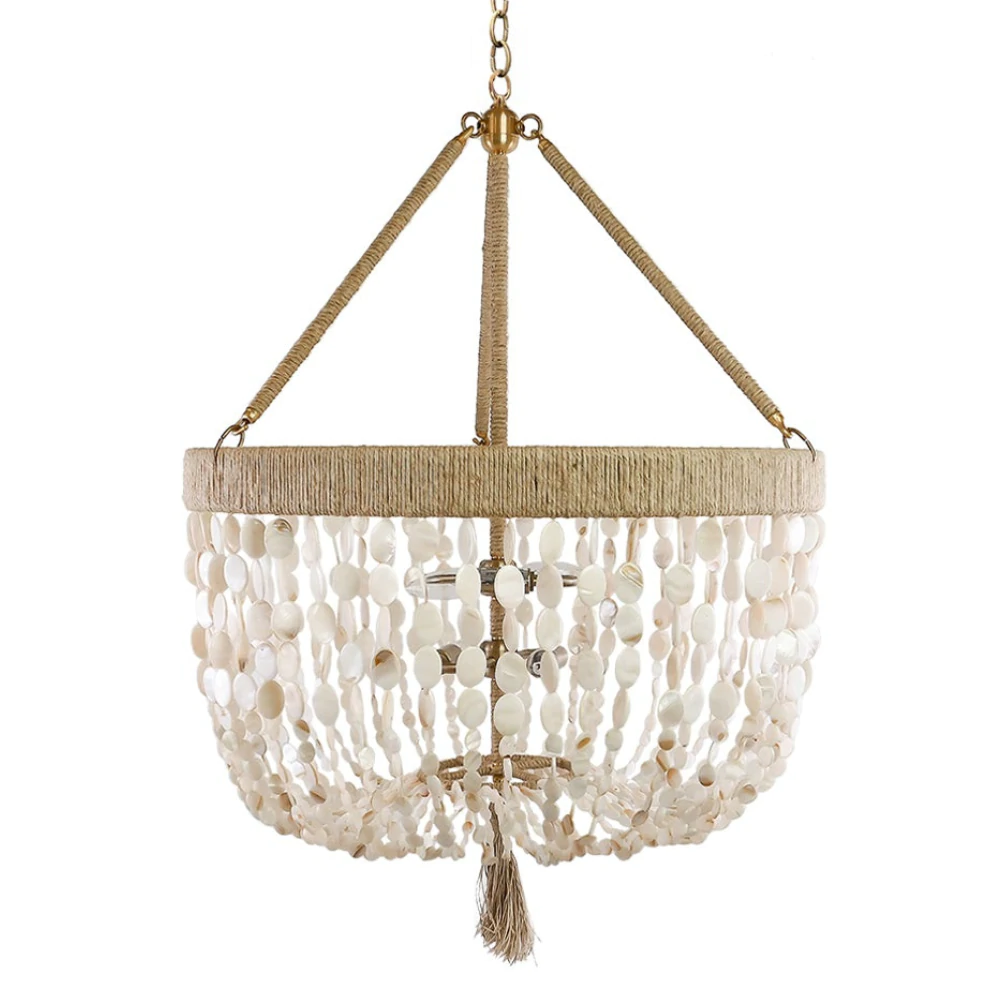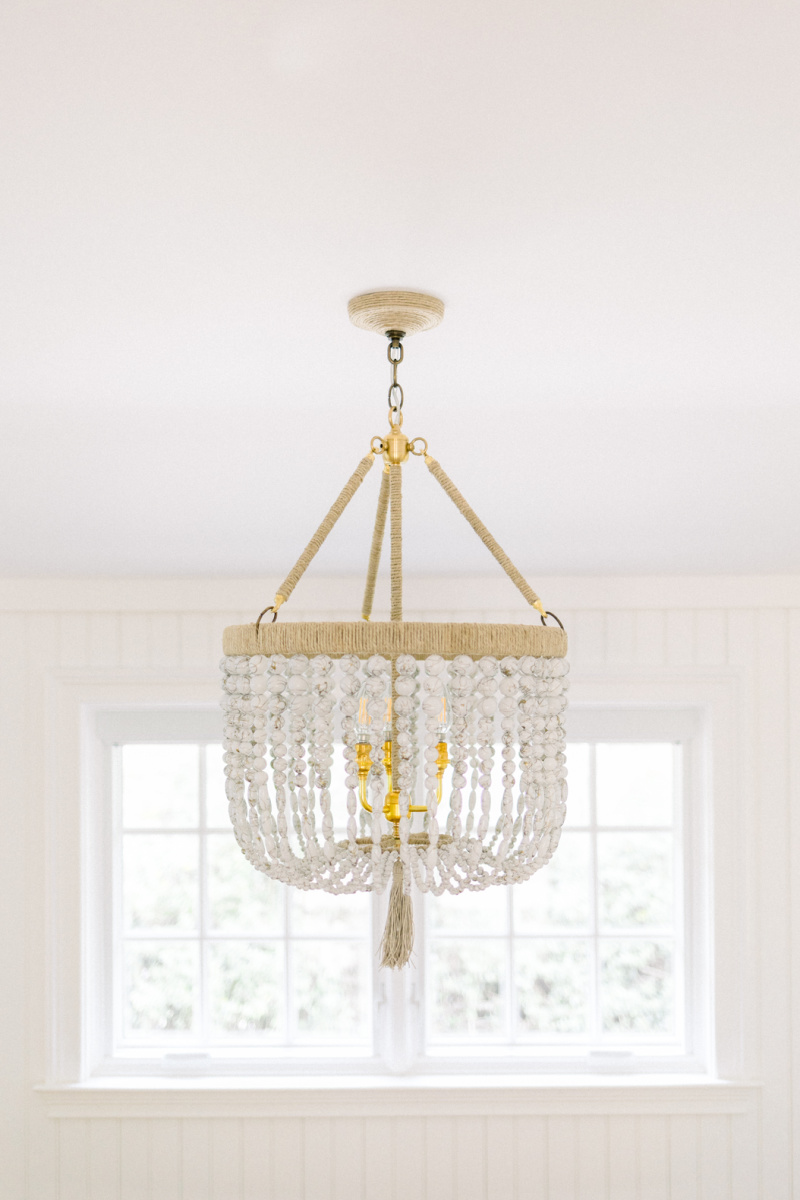 Snowberry has no formal dining room. Between the kitchen and great room, we have what’s essentially a breakfast room. I knew I wanted a Ro Sham Beaux beaded chandelier. We had two in our Fidalgo Island house, and they were stunning. There are many frame styles, sizes, bead choices … and hardware finishes. I chose to go the custom route working with Mary Ann of Classic Casual Home because I wanted to combine two styles. Serena and Lily offer two Ro Sham Beaux styles, the Malibu and Seychelles, each in two sizes.