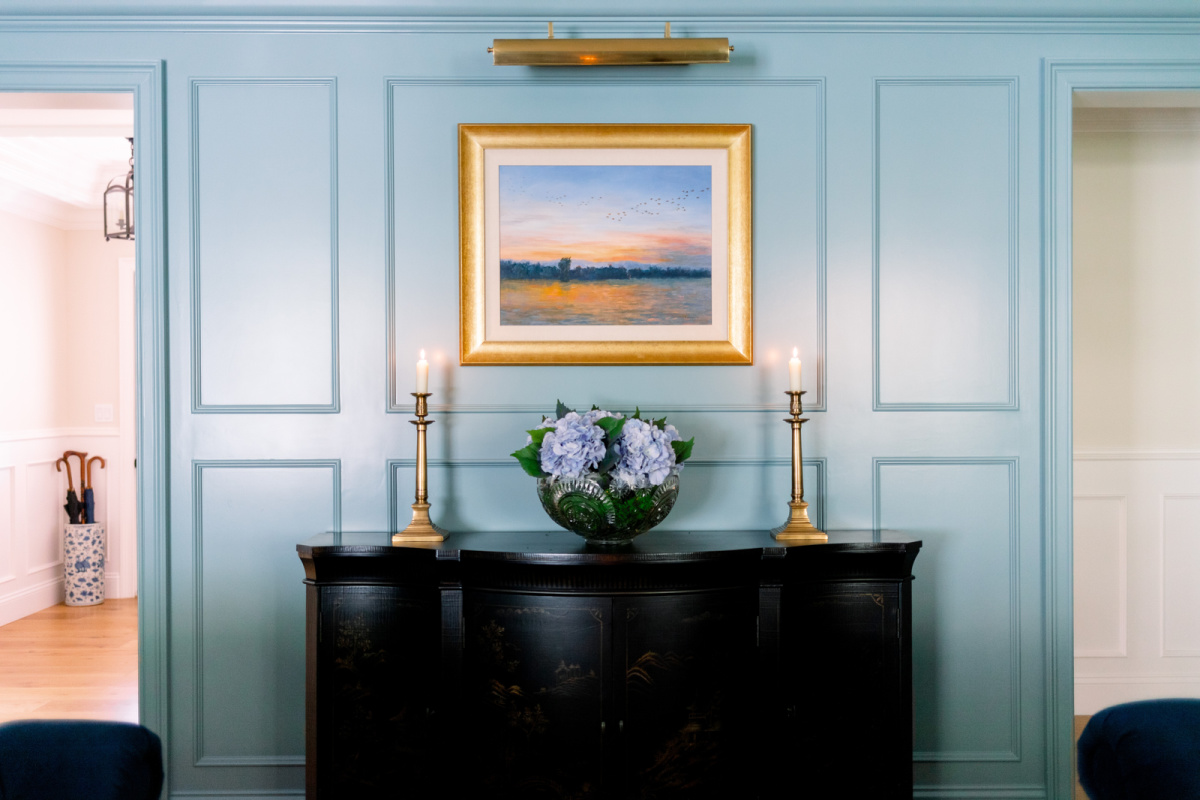 The library is Snowberry’s original living room. We decided against any ceiling lights. No can lights, no ceiling fixture. Nothing that would draw attention to the low ceiling. What we did do is paint the ceiling white and add perimeter lighting. A pair of Modern Library Wall Sconces over the fireplace and Dean Picture Lights over the bookcases.