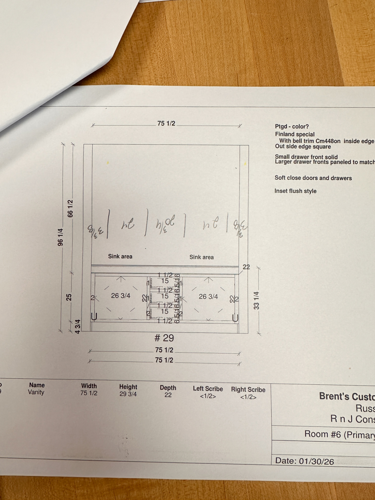 • I got a first look at our cabinetry and built-in drawings. Designer extraordinary, Ashley from Eye-for-Pretty, guided me through the process of fine tuning the design details. We’re waiting for revised drawings, and pricing … I’m braced for impact.