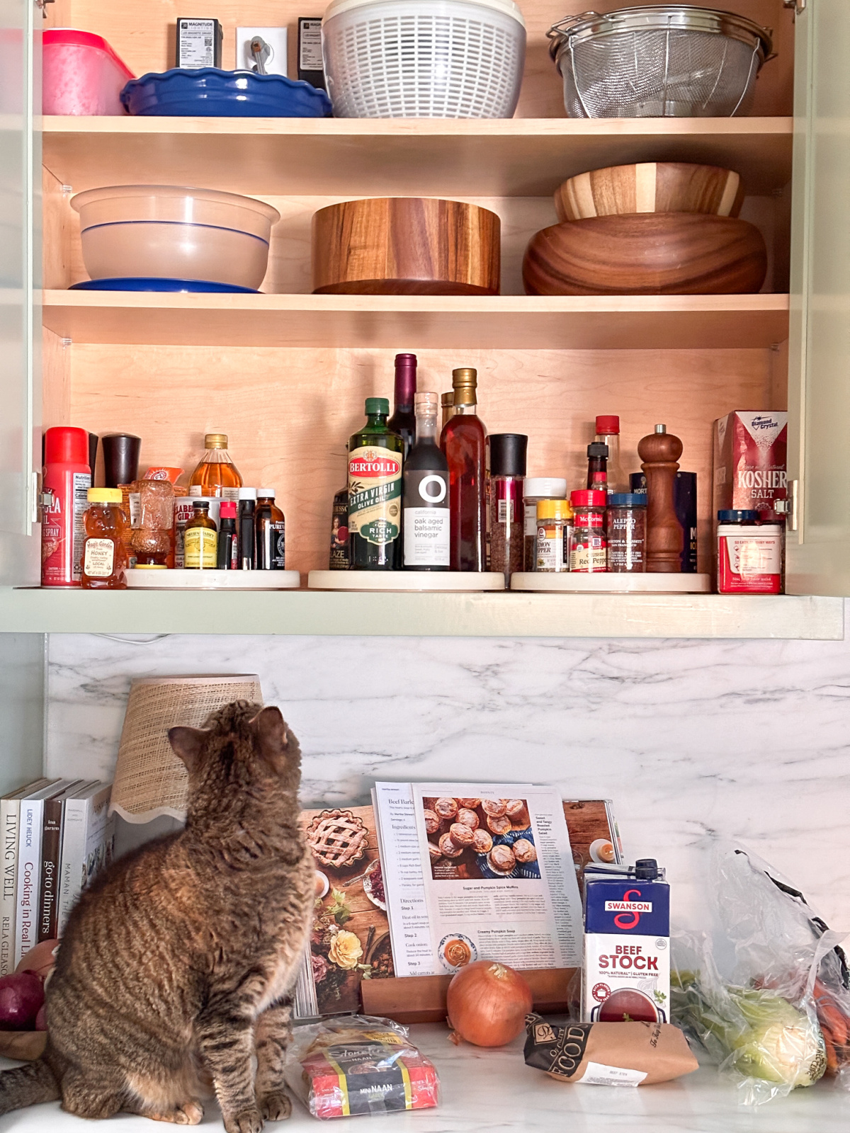 The top shelf of the upper cabinets is impossible to reach without retrieving the step-stool from the garage … which I find aggravating. It’s a good place to store infrequently used things like roasting pans. I’ve become such a decluttering pro that one shelf is entirely empty and its going to stay that way.