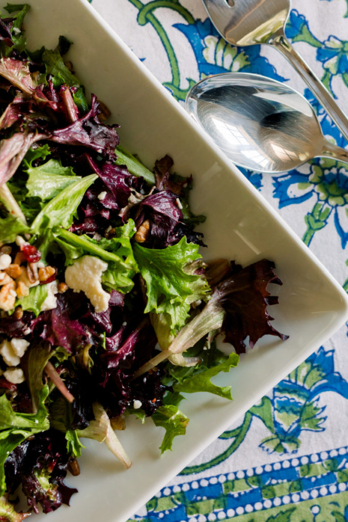 With a mixed green salad topped with pecans, dried cranberries and crumbled feta.