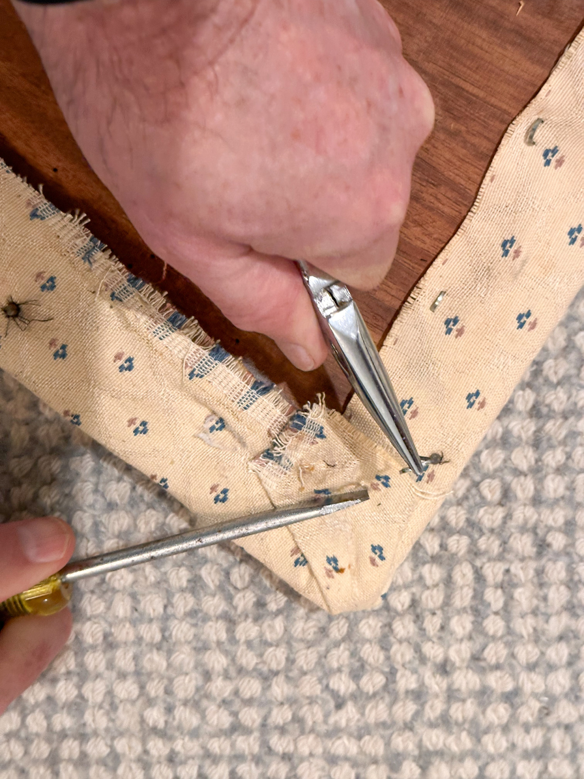 2. I could totally relate to Jim asking weekly, “What are you going to do with that chair?”! My husband does the same thing when he wants me to work on some project. I can usually ignore it for a couple months and then I break down and, like you, have him help me do what needs to be done. Our very first apartment dining chairs were painted wooden chairs that we stripped, refinished with wood stain and recovered the seats. I found a pretty Williamsburg upholstery fabric remnant for $10. We were so poor! That was 40 years ago. A ton of work, but those chairs were repurposed many times throughout the years with new seat upholstery. Always love your posts! They make me smile (and often laugh out loud).
