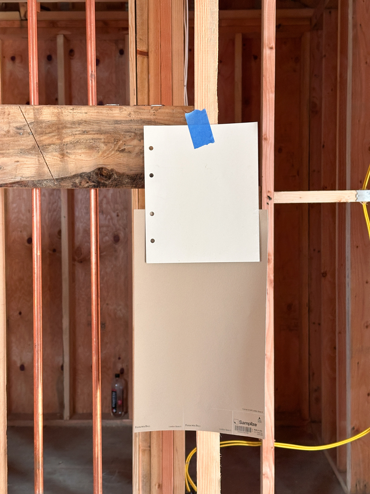 If you’re not familiar with Samplize, they offer peel and stick paint samples for Benjamin Moore, Sherwin Williams, and Farrow & Ball paint colors. The swatches come in two sizes … 9 x 15 (what I ordered) and a larger format 15 x 18. They’re also fast, I ordered in two batches and both were delivered the next day (I didn’t pay for overnight shipping). Instead of peeling and sticking I use painters tape so I can move them around. Once the drywall is up I’ll go through the process again.