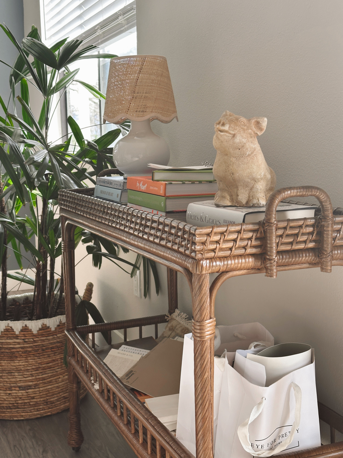 Your pig is fabulous, cute, with lots of personality too. I like cute pigs. Your bar cart is eye catching, great purchase.