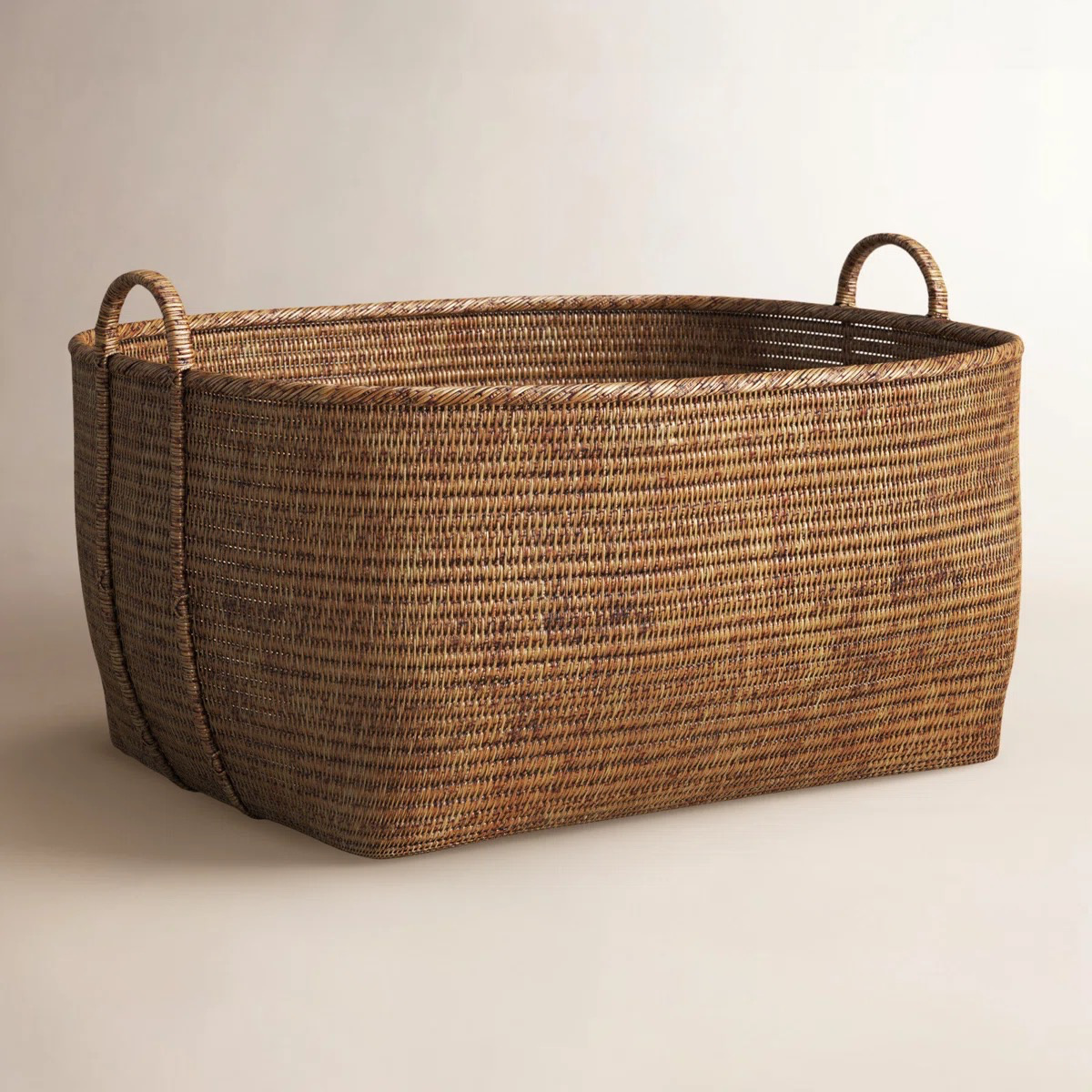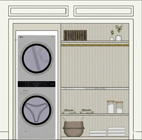The Folly’s laundry situation will be a little different. It’s not a room, and it’s not a closet … exactly. It’s located just inside the entry to the primary bathroom and directly across from Jim’s closet. The stacked (one unit) washer dryer will have retractible doors, but the shelf space and folding counter to the right will be open and I’m eyeing these large rattan baskets, for the bottom shelf, to function as hampers.