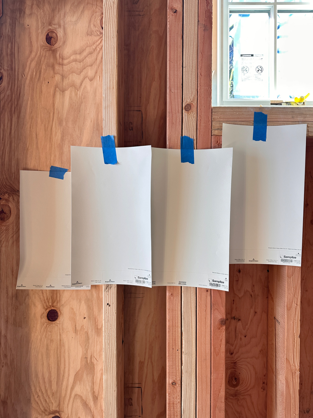 If you’re not familiar with Samplize, they offer peel and stick paint samples for Benjamin Moore, Sherwin Williams, and Farrow & Ball paint colors. The swatches come in two sizes … 9 x 15 (what I ordered) and a larger format 15 x 18. They’re also fast, I ordered in two batches and both were delivered the next day (I didn’t pay for overnight shipping). Instead of peeling and sticking I use painters tape so I can move them around. Once the drywall is up I’ll go through the process again.