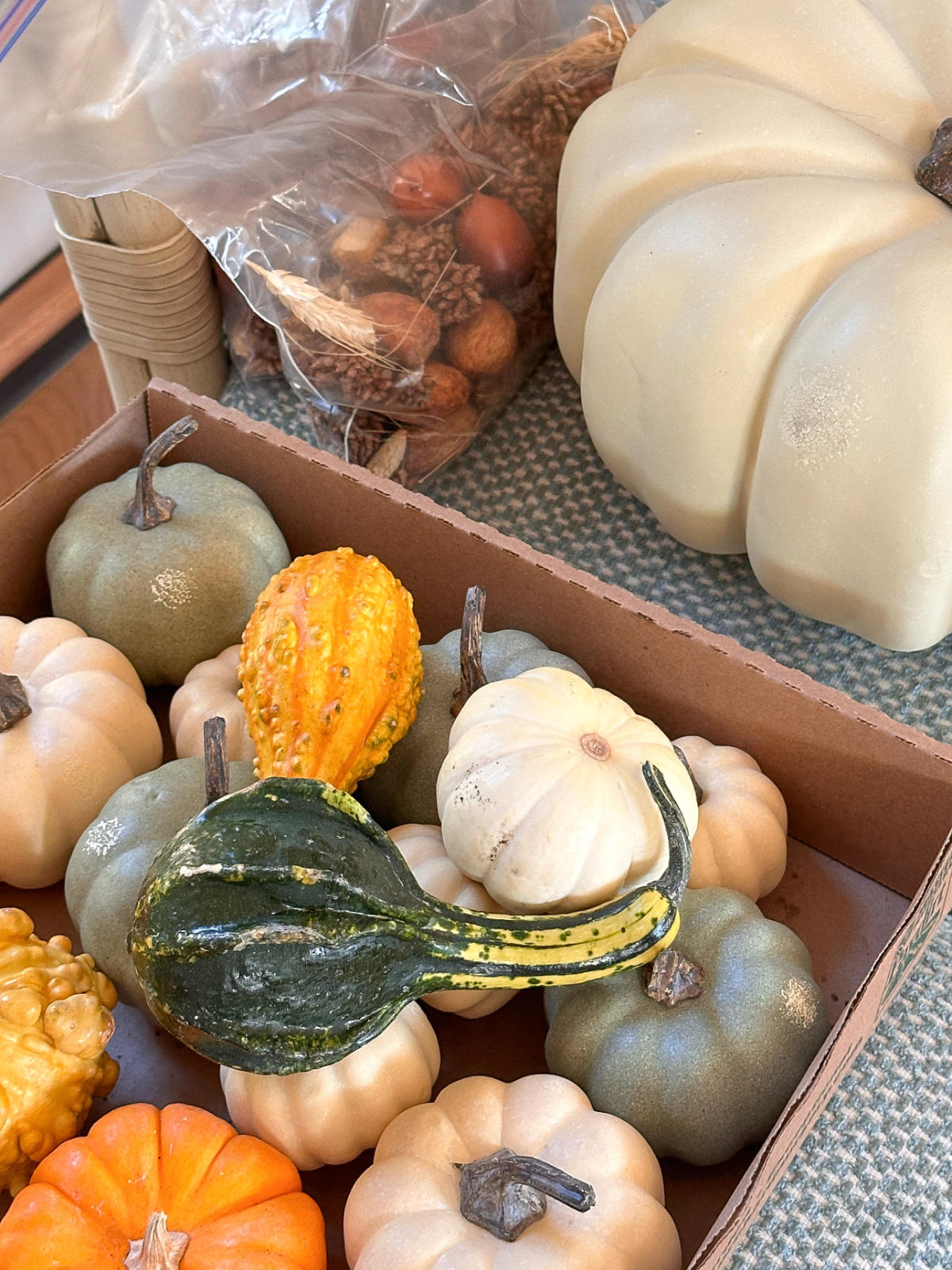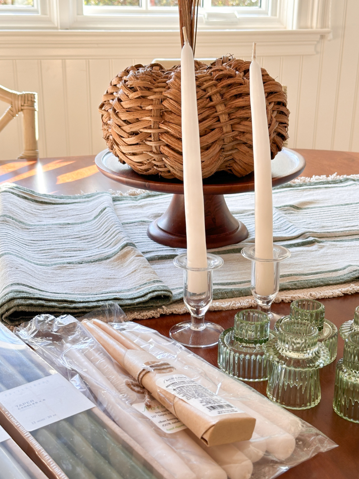 To prep for Ali’s arrival I cleared and cleaned our small, oval dining table and set it with this woven, neutral table runner. Then I laid out my collection of pumpkins, vases, candles … all the fall stuff.