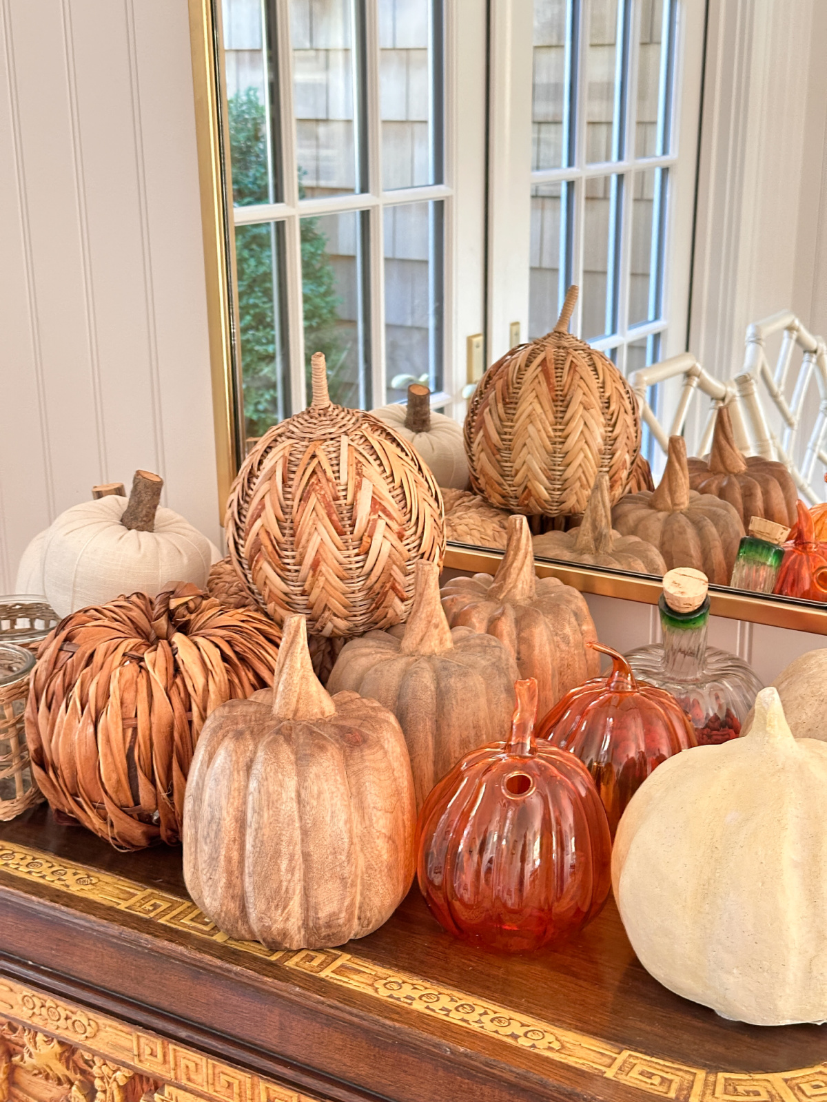 From there we worked our way out placing medium sized solid wood and terracotta pumpkins, alongside small rattan wrapped vessels and six green glass candleholders with white or ivory pillar candles. I found the candleholders on Amazon, they come in a set of six, with three different shapes/sizes. The set is only $18.99 and they come in a ton of colors.