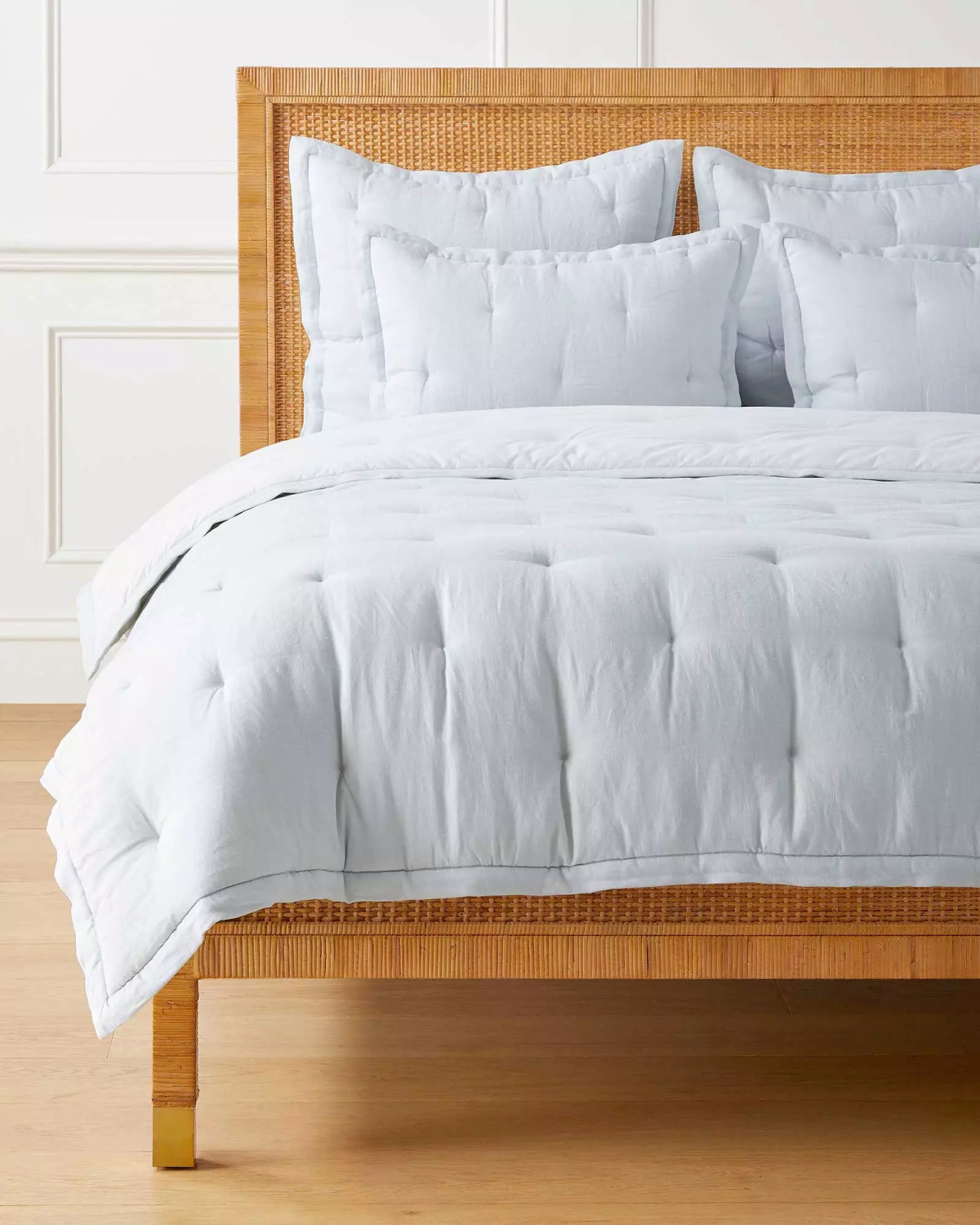 I also ordered Serena & Lily’s linen comforter in sky. It’s very duvet-like without the nightmare of putting on and taking off a duvet cover. That chore is even worse with a king-size comforter and I dread it. I use a king-size comforter on a queen bed because I like the longer length on the sides. I ordered the matching shams too.