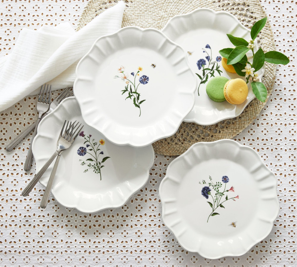 The Lily of the Valley salad plate shown in both settings is no longer available and they’re showing this pretty new set of 4 floral plates in its place.