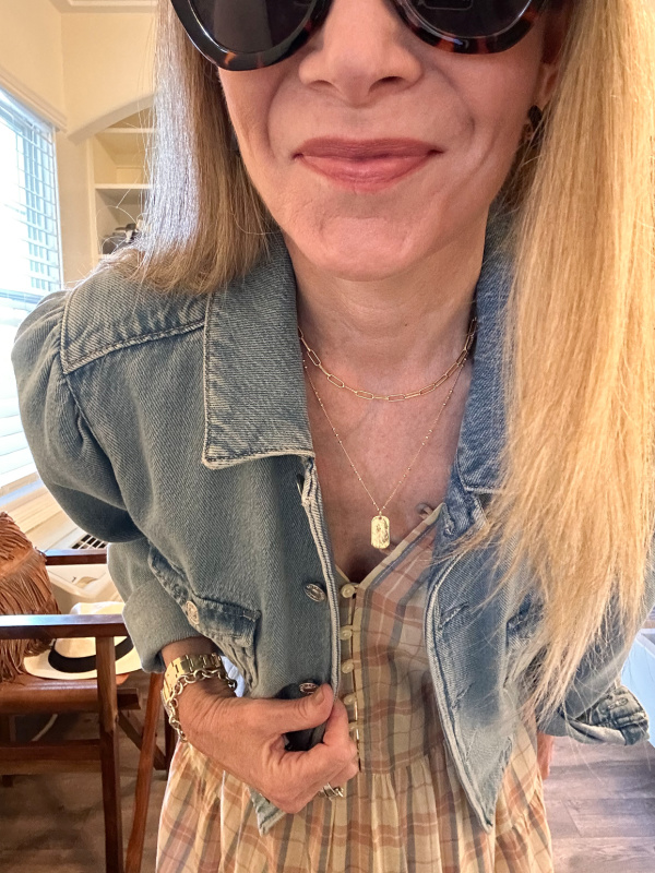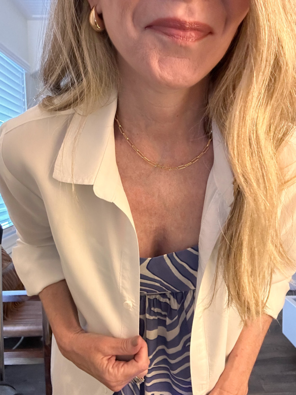 The best thing about road trips, or local travel, is you can bring more clothes. I zipped all my dresses and jackets into a garment bag. And I brought a pair of sandals for each dress … a big no no when packing a suitcase for air travel. I brought my layered necklaces, which I get a lot of use from, and wear them together or on their own. You can also buy the paperclip chain separately. And because it’s a chain … the length is easily adjustable.
