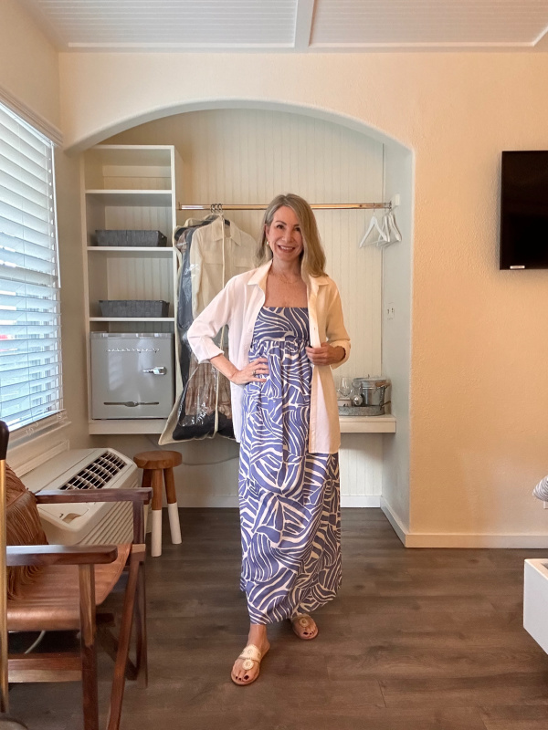 On our last day the temperature hit 99. This Rails dress was a late summer purchase that I hesitated over it because … it was late summer. But I’m so glad I bought it and I’ve worn it on repeat. It will definitely be in my suitcase for our cruise at the beginning of the year. It has a smocked back and is very comfortable. I wore it with an oversized shirt by Cloth & Stone. This one from Mango is similar. Wearing a shirt as a jacket is an idea I got from wardrobe guru Allison Bornstein. I’ve been reading and loving her new book.