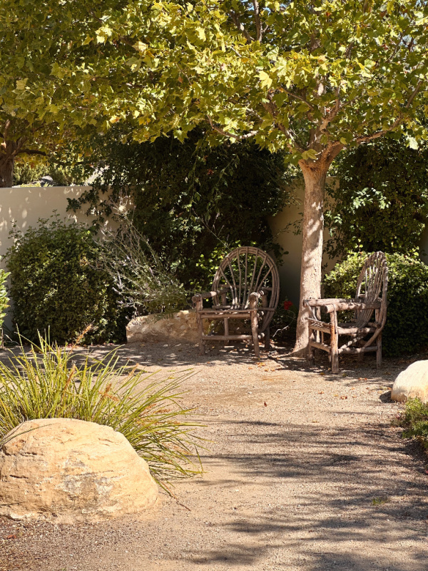 Evocative of white washed stables … everything about the motel is horse-ranch charming. Teak benches outside the rooms encourage guest to enjoy the warm days and cool nights. And in the center of the parking an island oasis with two fire pits and several seating areas set up for guests to enjoy morning coffee and afternoon wine.