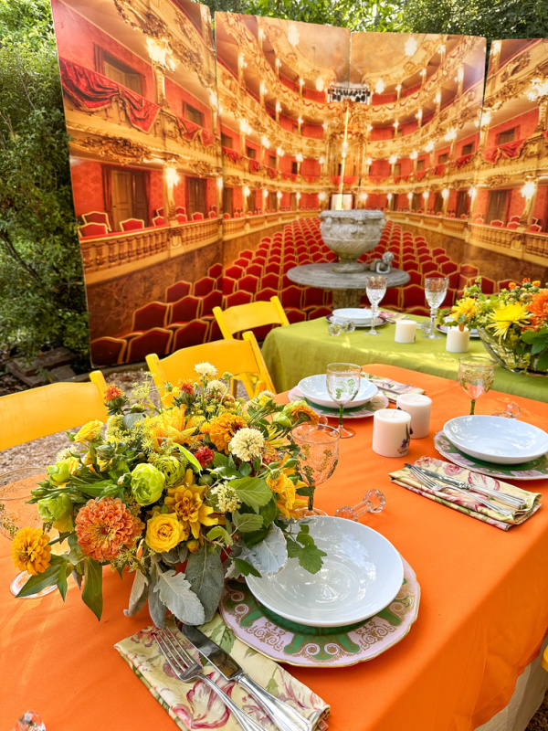 Last weekend Jim and I attended a lovely soiree in the garden of our favorite Contessa to celebrate her 63rd birthday! Guests were instructed to dress in the party’s green, yellow and orange color scheme. And everyone complied. It was a very warm summer night … and Contessa’s garden was enchanting. You can read all about her spectacular party at The Vintage Contessa Blog here. And watch my party highlights video here.