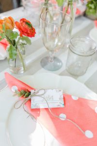 We folded the coral, polka dot napkins in a simple triangle shape and tied the place cards at the top with twine … and a sprig of faux boxwood tucked in at the top.