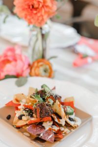 Coral and orange peonies, dahlias, viburnum, ranunculus, and roses – with beautiful greenery – arranged in rectangular wooden boxes ran down the center of each table.