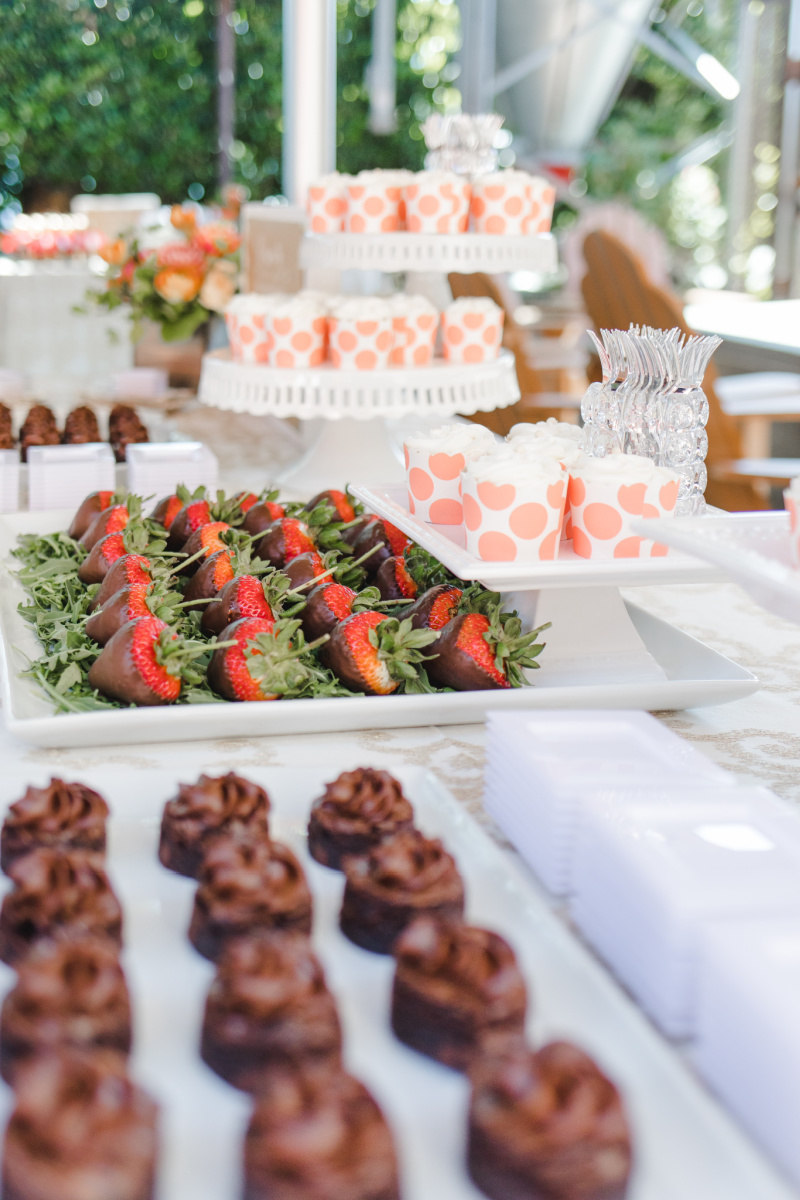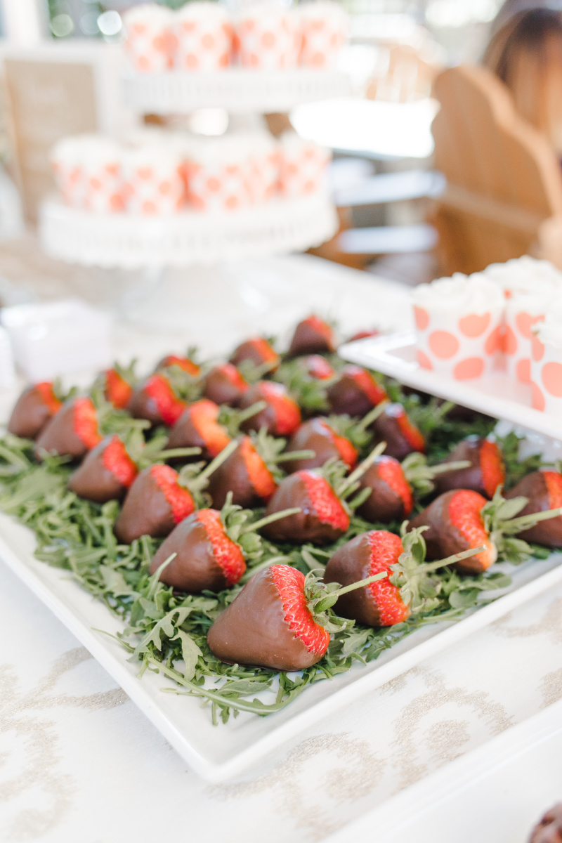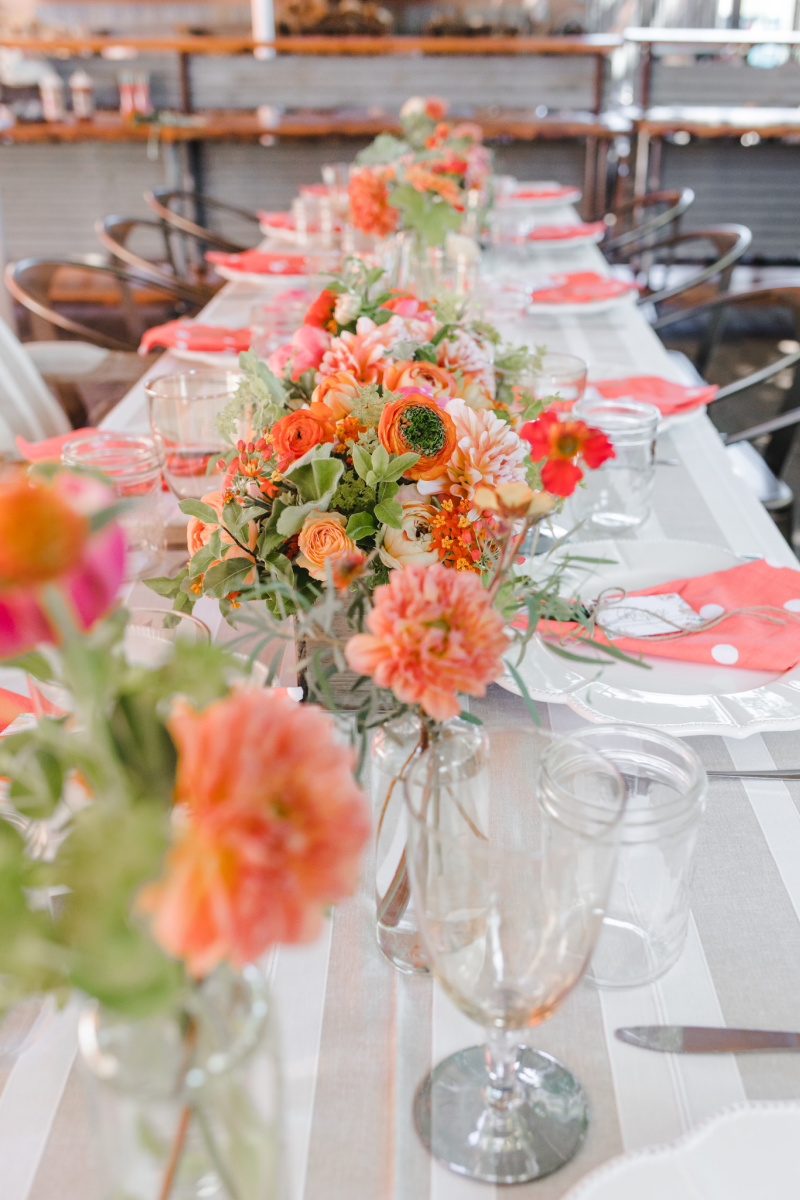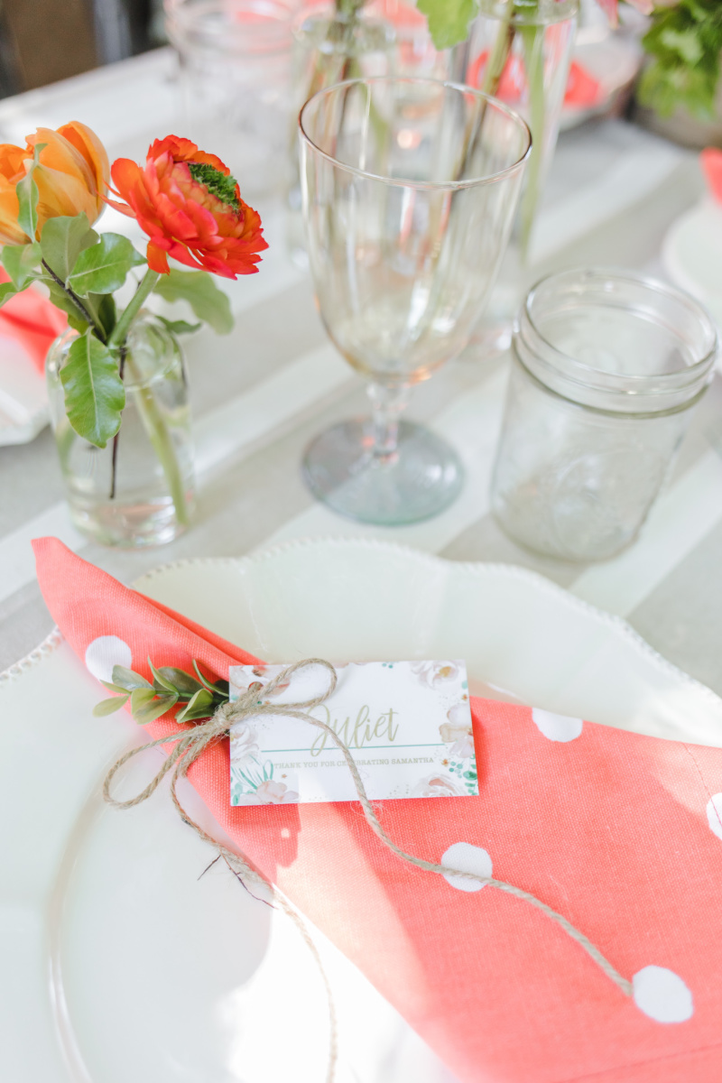 Borrowing liberally from Cindy’s baby shower template (hey, she offered) I tracked down her cute coral, Kate Spade polka dot napkins. The napkins became the jumping off point for our table settings and overall aesthetic.