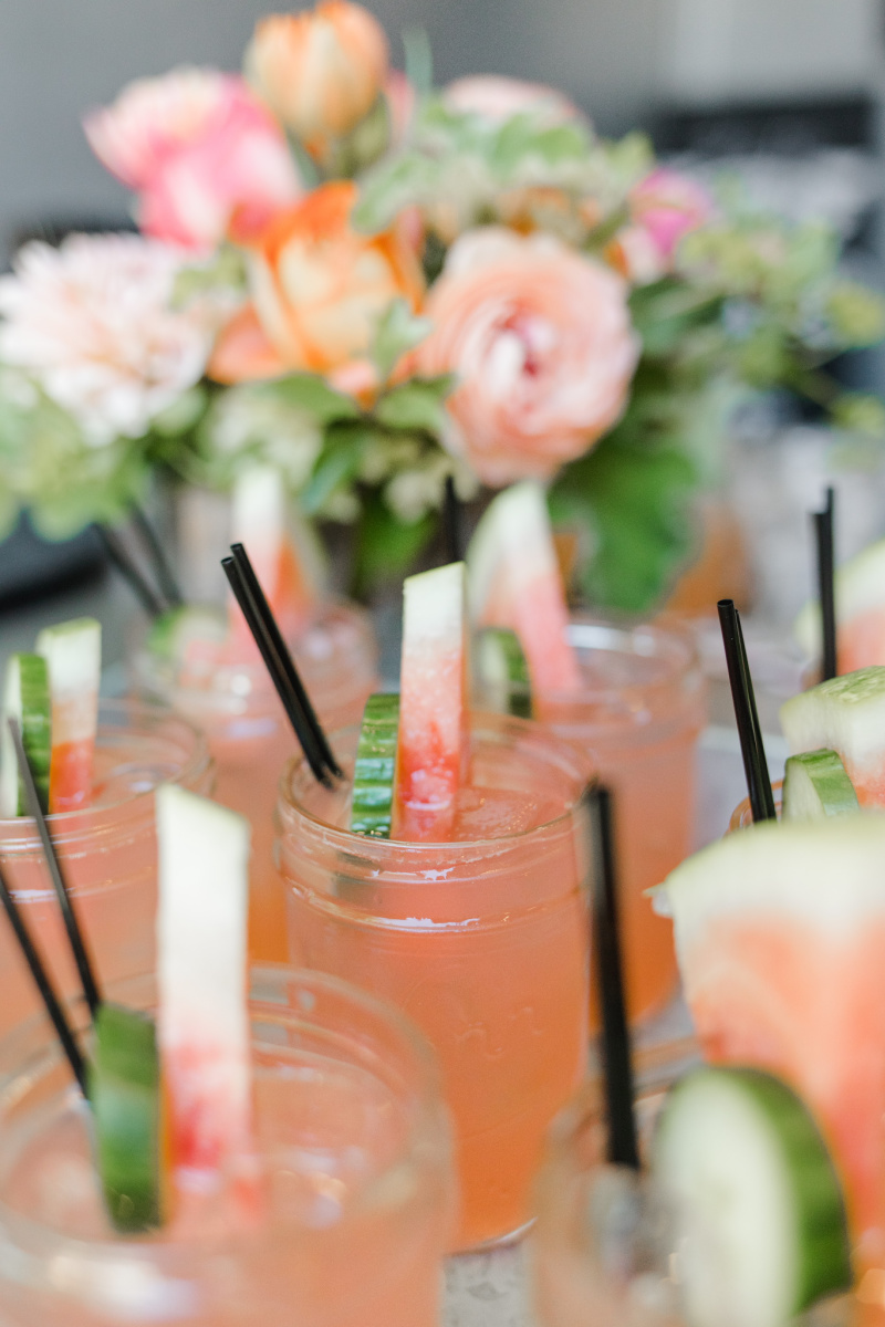 Upon arrival guests were offered a cucumber watermelon cocktail or mocktail served in mini mason jars. And I tracked down these cute cocktail napkins also copied from Cindy’s post.