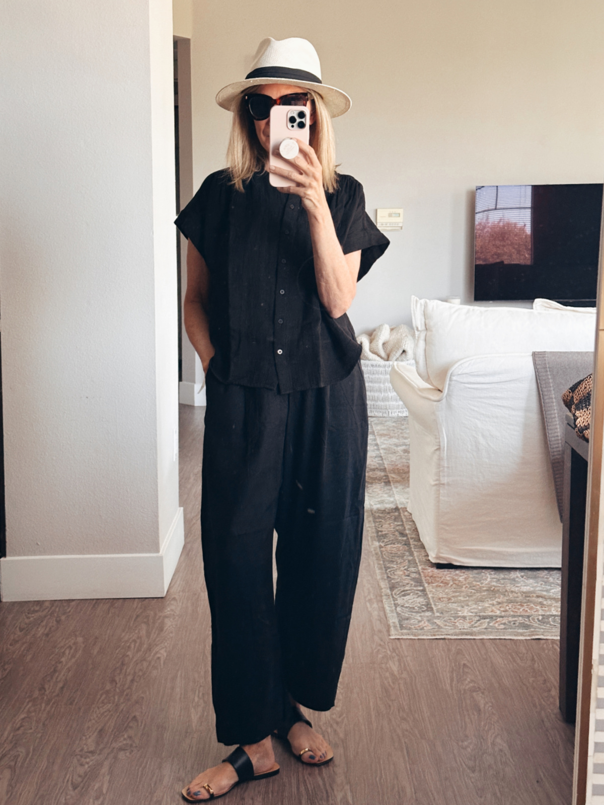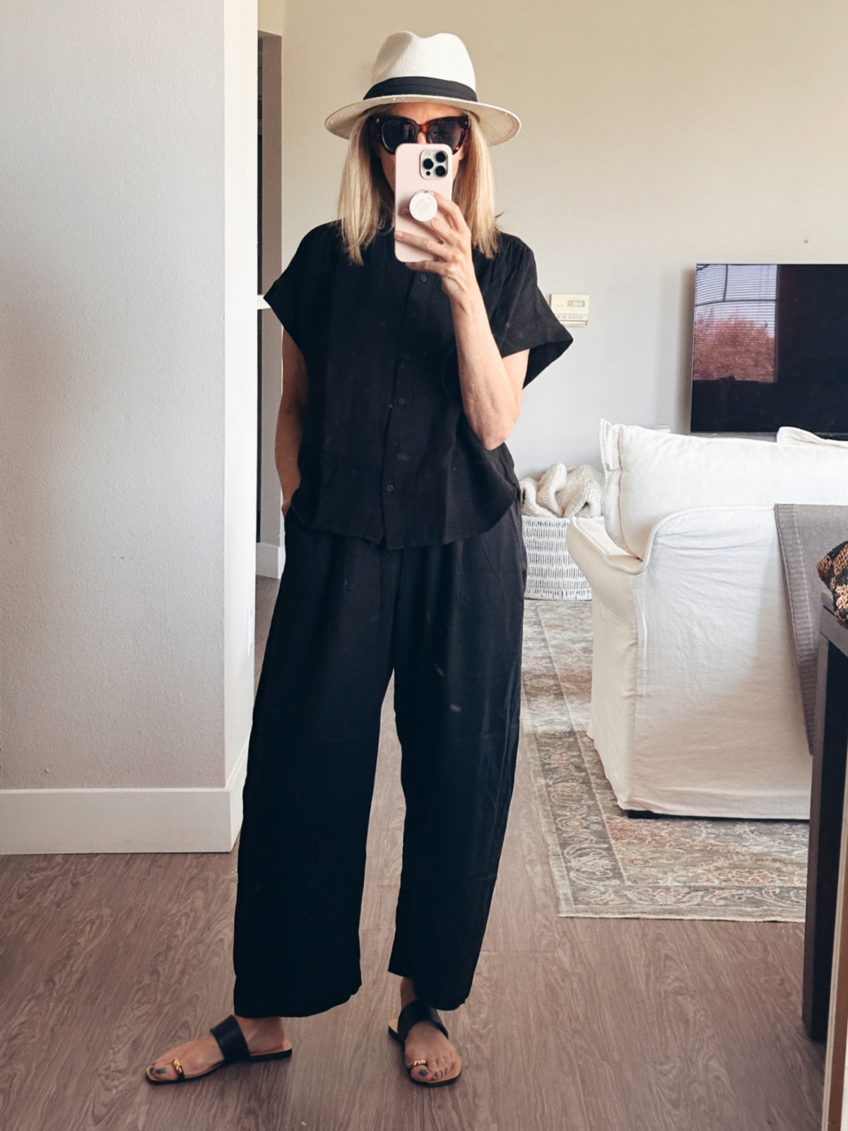I’m wearing this linen blend barrel pant in the photos below because the cotton gauze wasn’t available. The good news is that the two pair beautifully together and I can’t tell there’s a difference in fabric. It might be because they’re black, not sure the same would hold true in a lighter color. Anyway, the pants I’m wearing are a medium and a little big, I’ll take them to the tailor and see if we can adjust the elastic waistband. Otherwise I appreciate the extra roominess.