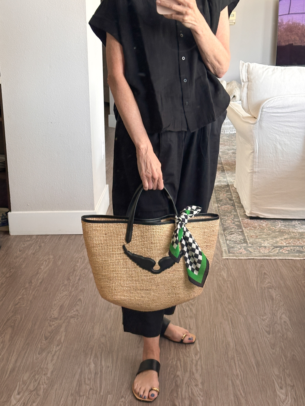 Back to the bag and scarf situation. It’s a Zadig & Voltaire basket bag and it’s an ideal summer bag for everyday running around, day trips to the wine country, and travel. If you’re not a fan of the brand’s signature wings, turn it around to the no-wings side. I kind of like the wings. One of the best features is that it has both tote size and shoulder length handles. The longer handles fall easily into the bag and out of the way. It comes in a mini size too.