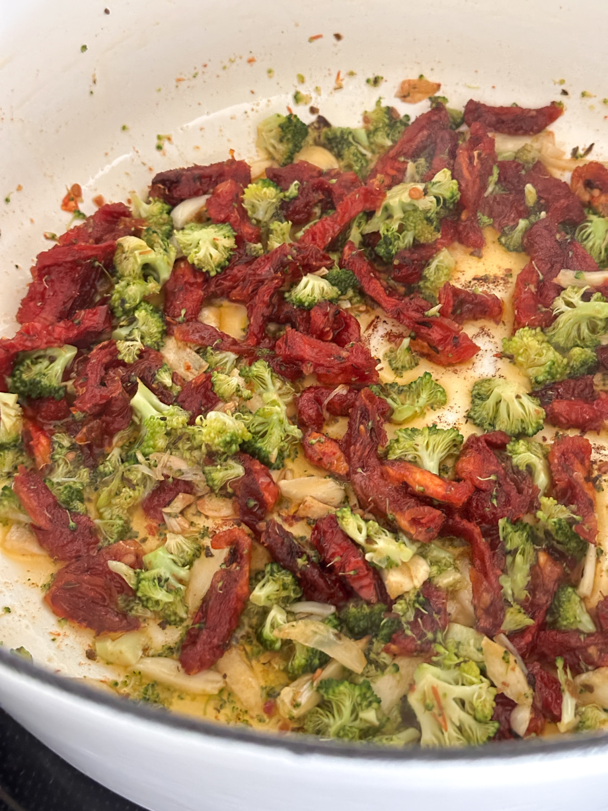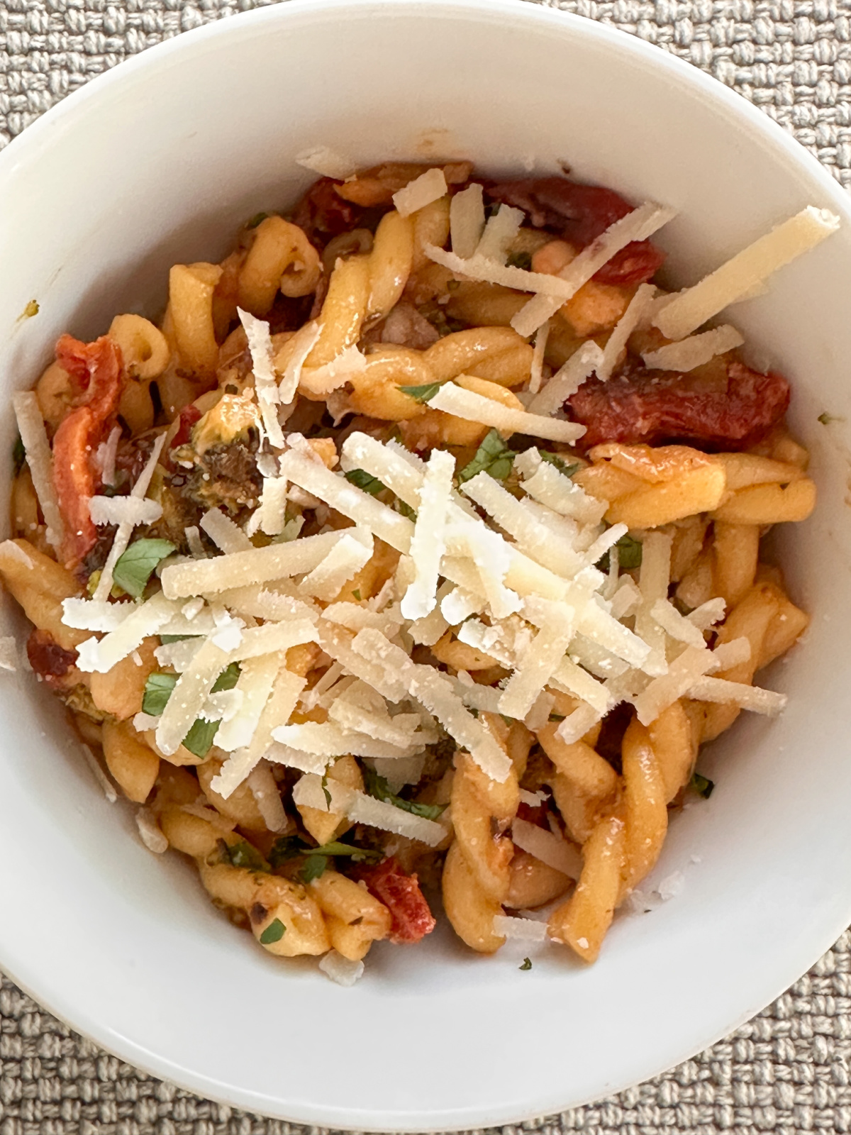 Last weekend Mary Ann (Classic Casual Home) shared this recipe for Cavatappi with Sun-dried Tomatoes and Cannellini Beans. I made it for lunch this week … it’s easy and delish. It’s a meatless meal, but you could easily add Italian sausage or something like that. I took creative license and added chopped broccoli.