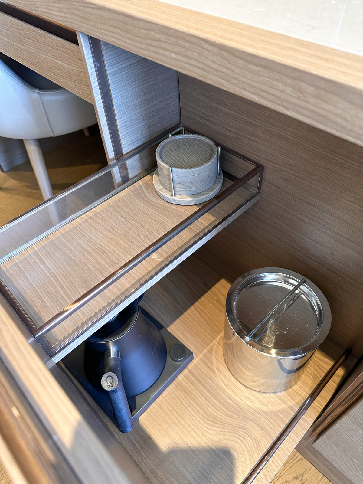 The very best part of the room, the king size bed. The most comfortable bed ever. Ever. We slept like babies and we chatted with other guest who said the same thing. I took a peek at the mattress, it’s Matermoll. Upon further investigation it appears this is a brand specifically for cruise ships and yachts. I’m sure the Frette bedding added to the comfort level. Speaking of Frette, the yachts bathrobes are the softest and coziest I’ve ever experienced. Same goes for the towels … also Frette. Whatever the cost, they’re worth it.