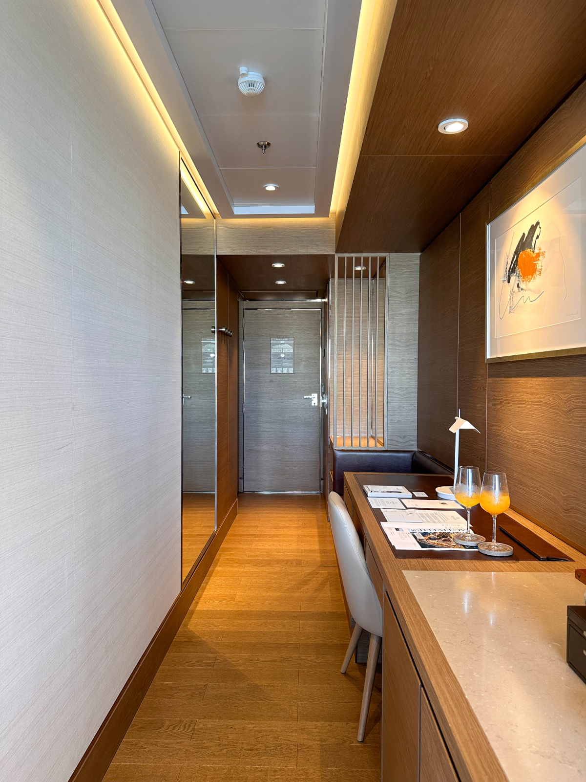 The suite has a long entry hall, small dining and sitting areas, a nice bedroom with good storage and fairly spacious outdoor terrace … we couldn’t ask for anything more. Oh, the bathroom was a nice surprise too … more about that in a bit.