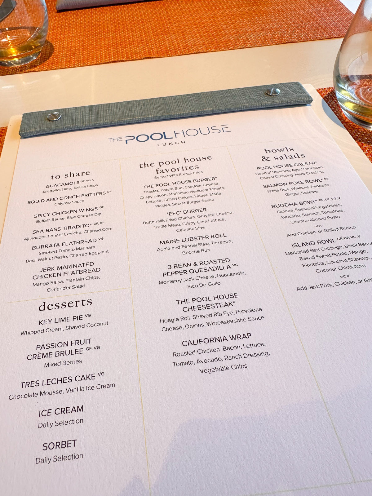 The Pool House – the most casual restaurant on the yacht overlooking the main pool. It offers breakfast, lunch, dinner at late night dining. The taco trio is delicious and my favorite thing on the menu … that I ordered on repeat. They have a really good burger too.
