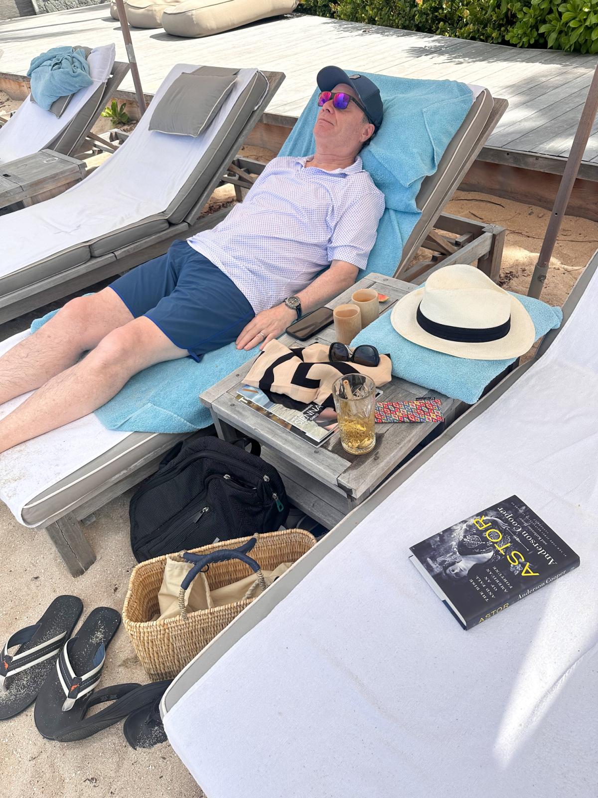 After lunch we took a walk down the beach and made our way back to our chaises before we reluctantly returned to the yacht. Before leaving we took a stroll through the Gypset La Boutique and Jim bought a fun shirt which he later regretted when he figured out he’d miscalculated the currency exchange. I was tempted by the cutest woven bag, but surprisingly I resisted. This is exactly how I want to spend everyday of vacation.
