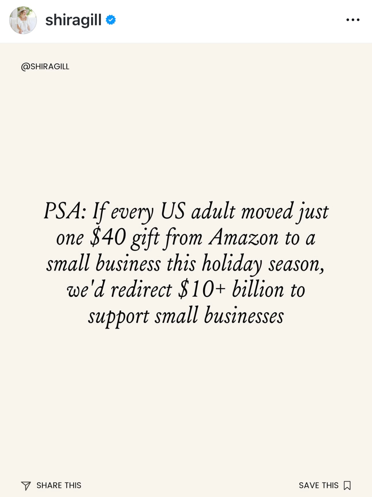 This statistic, shared by Shira Gill, blew me away. A little food for thought as we enter this make-it-or-break-it-month for our favorite stores.