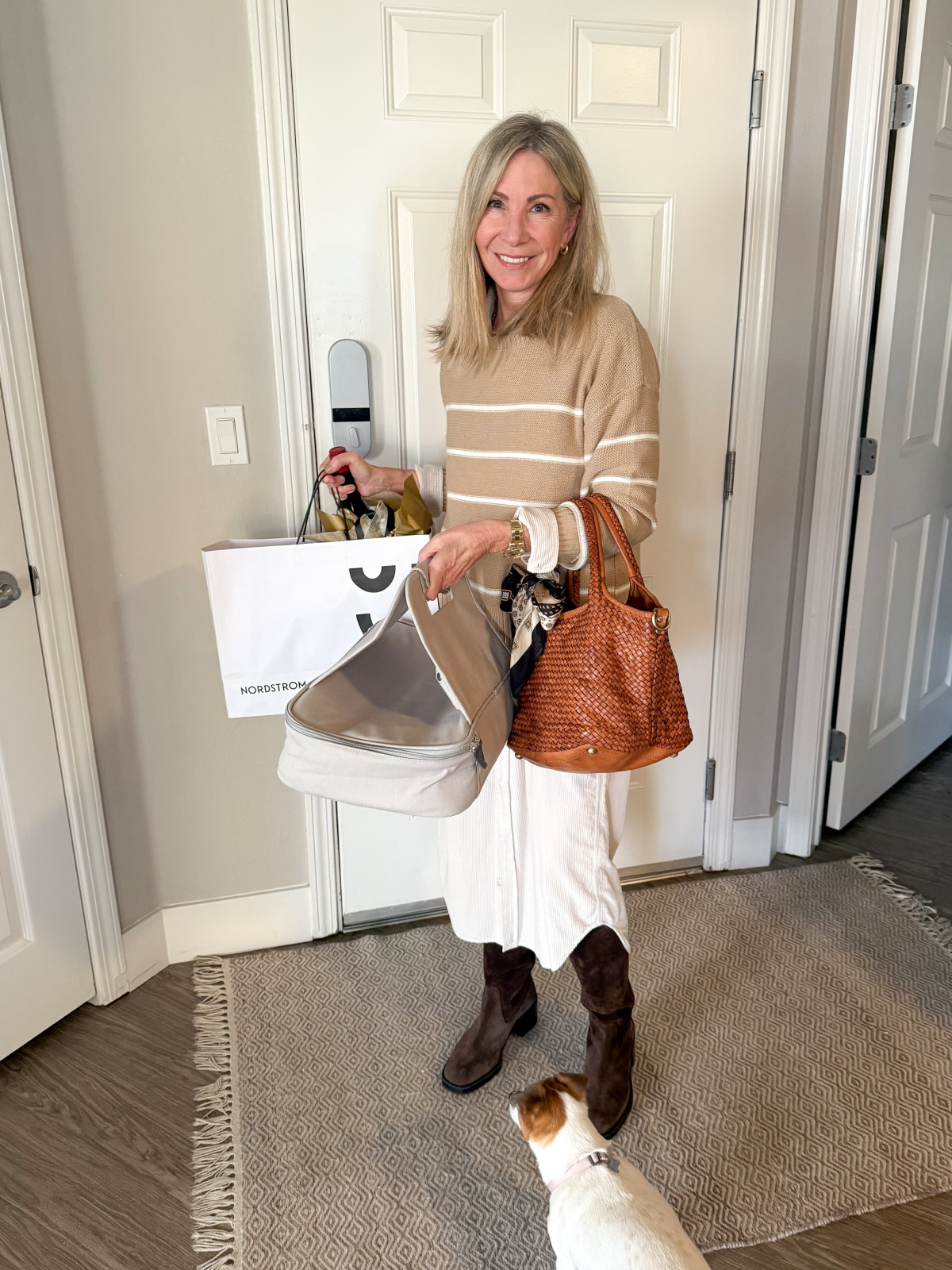 I’m wearing a Frank & Eileen corduroy shirt dress over a Michael Stars striped cotton sweater (similar) and Stuart Wietzman suede boots (similar).