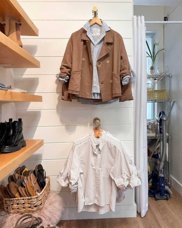 Speaking of stripes, last week when Kim and I went to see the Eye for Pretty spec house in Danville, we dropped by favorite boutique Flaunt for a look-see before lunch. Ever since attending Flaunt’s Frank & Eileen Fall Styling Event a few weeks ago their Silvio striped shirt in a subtle tan stripe has been on my mind.