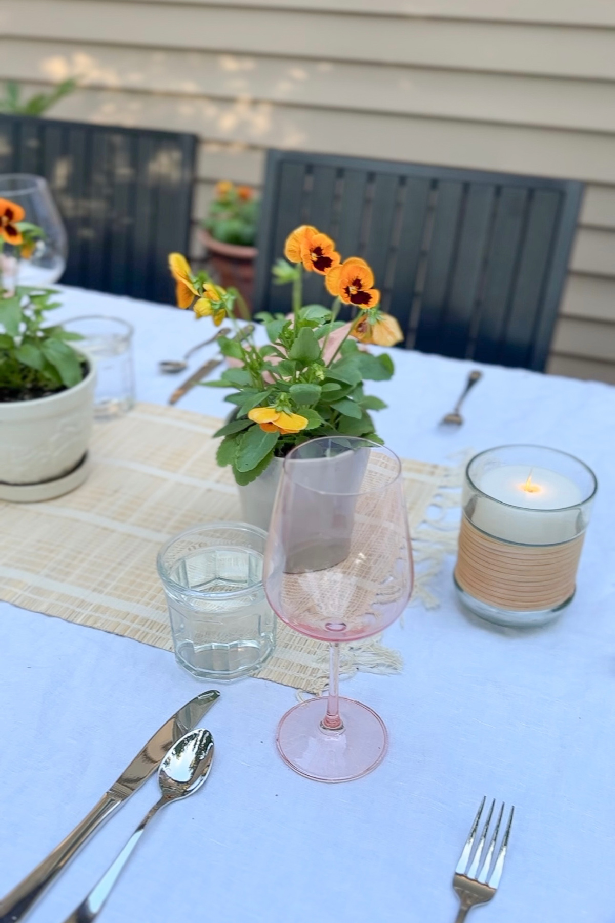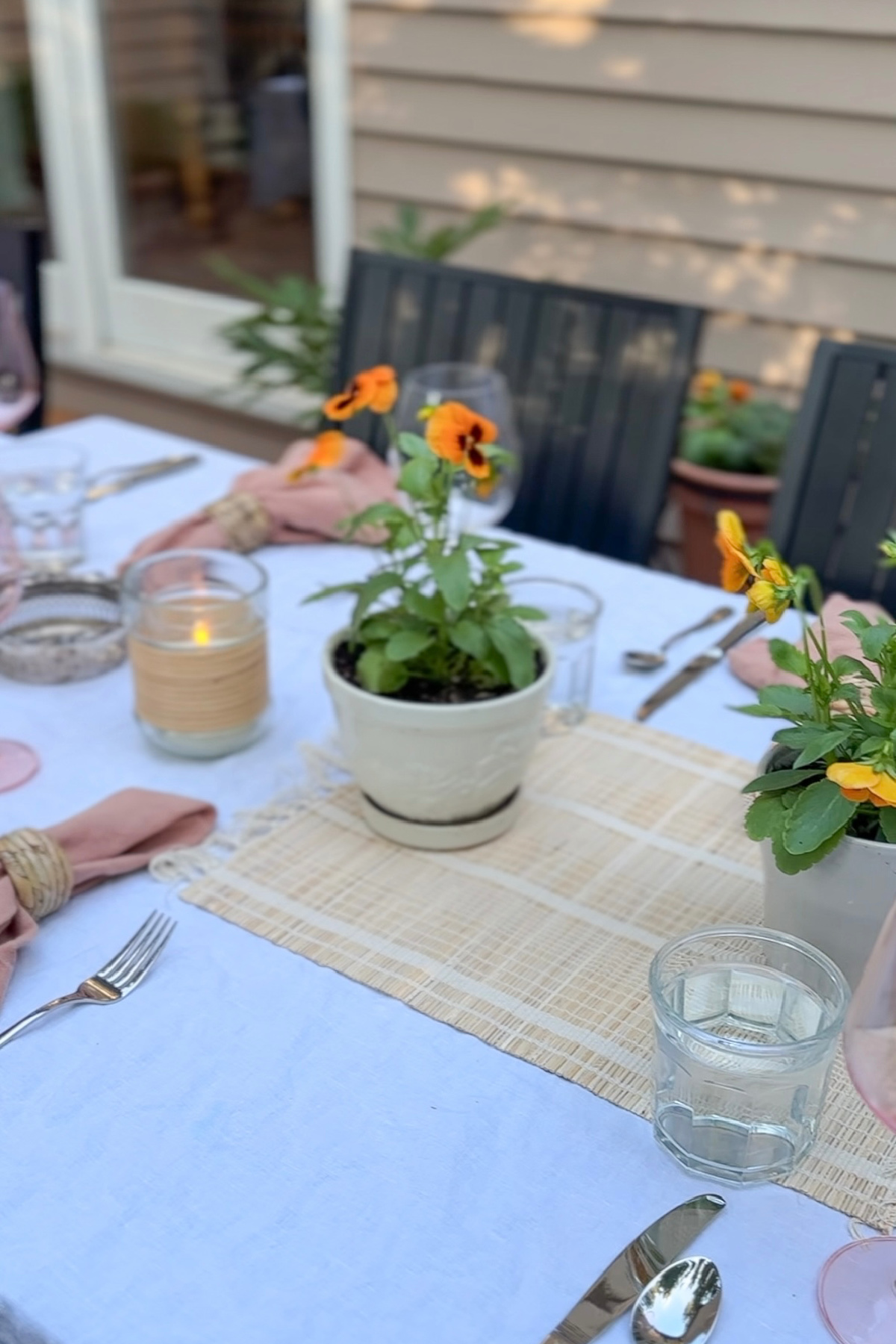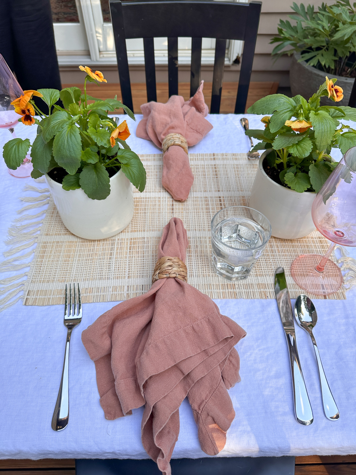 We ate at one long table covered in white linen tablecloths, with several woven placemats down the center dotted with potted pansies and raffia wrapped hurricanes. Terracotta napkins were corralled in seagrass napkins rings alongside classic Duralux water glasses and rose tinted outdoor wine goblets. Stunning.